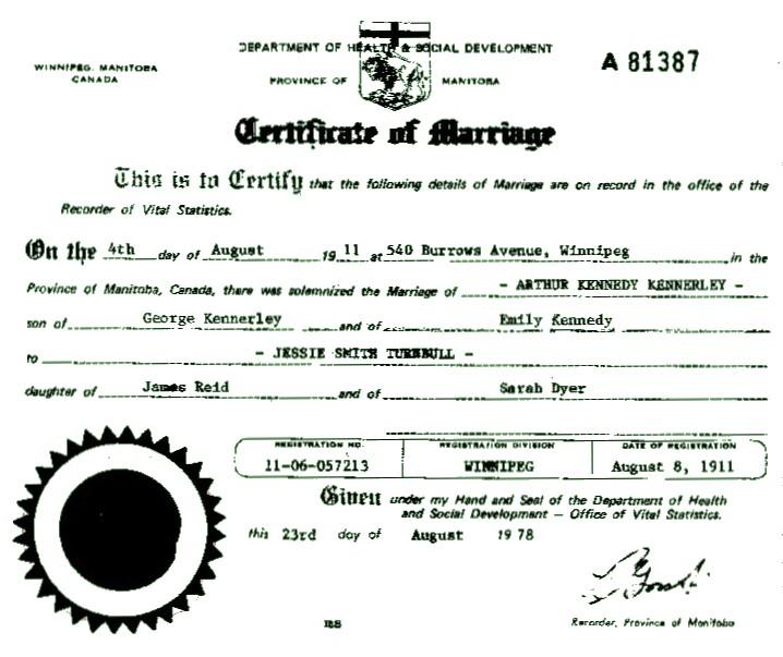 | Marriage | She married Arthur Kennedy Kennerley on 4 September 1911 in Winnipeg, Manitoba, Canada. Jessie Smith Turnbull was, age 19, Arthur Kennedy Kennerley was, age 29.9 |