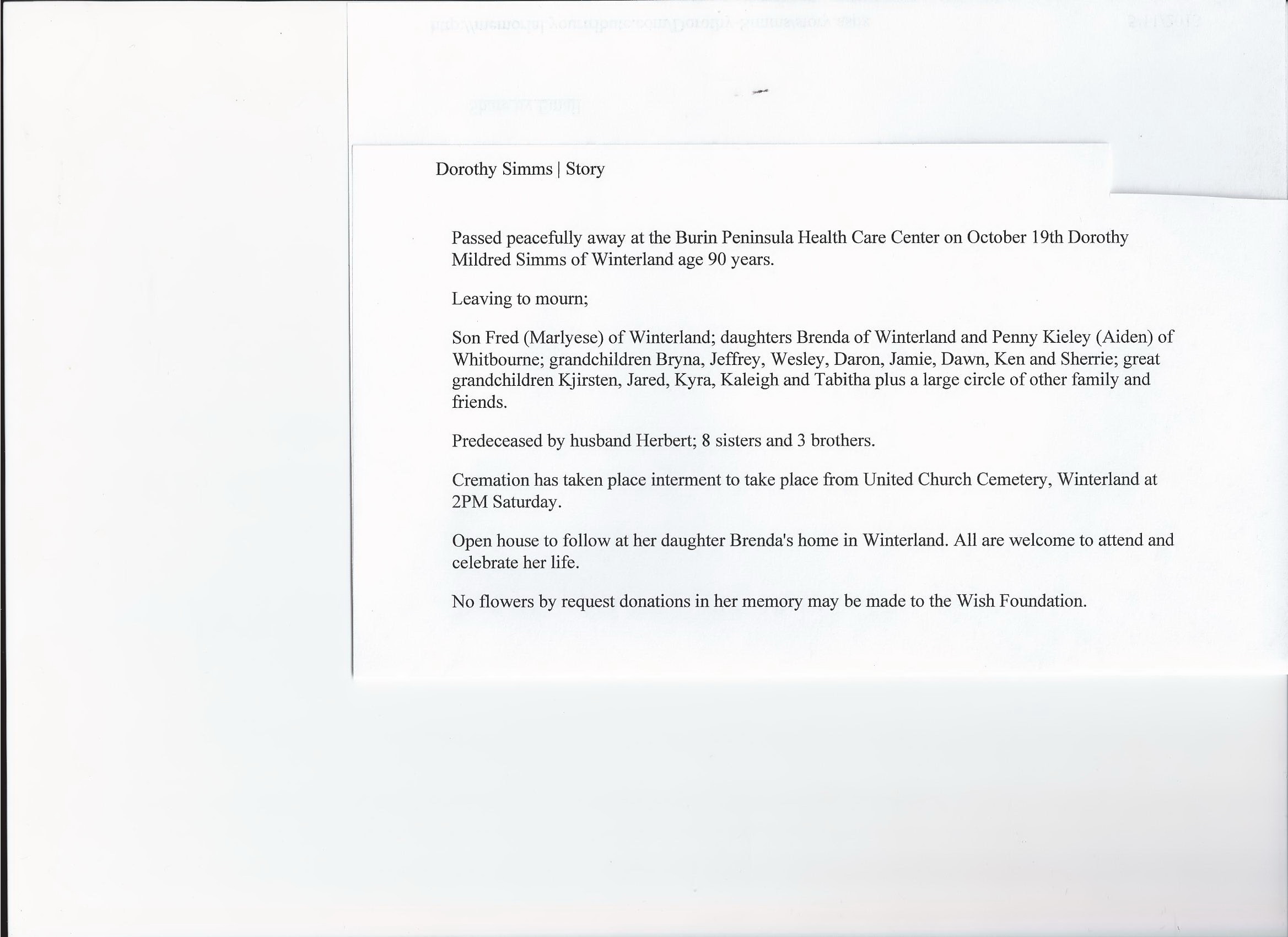 - [S1276] Ancestry.com, U.S., Cemetery and Funeral Home Collection, 1847-Current, Serenity Funeral Home, locations in Burin and Harbour Drive; Publication Date: 16/ Mar/ 2024; Publication Place: Burin Bay Arm, Nl, Canada; URL: https://serenityfh.com/tribute/details/1208/Dorothy-Simms/obituary.html, See source information provided with each entry.