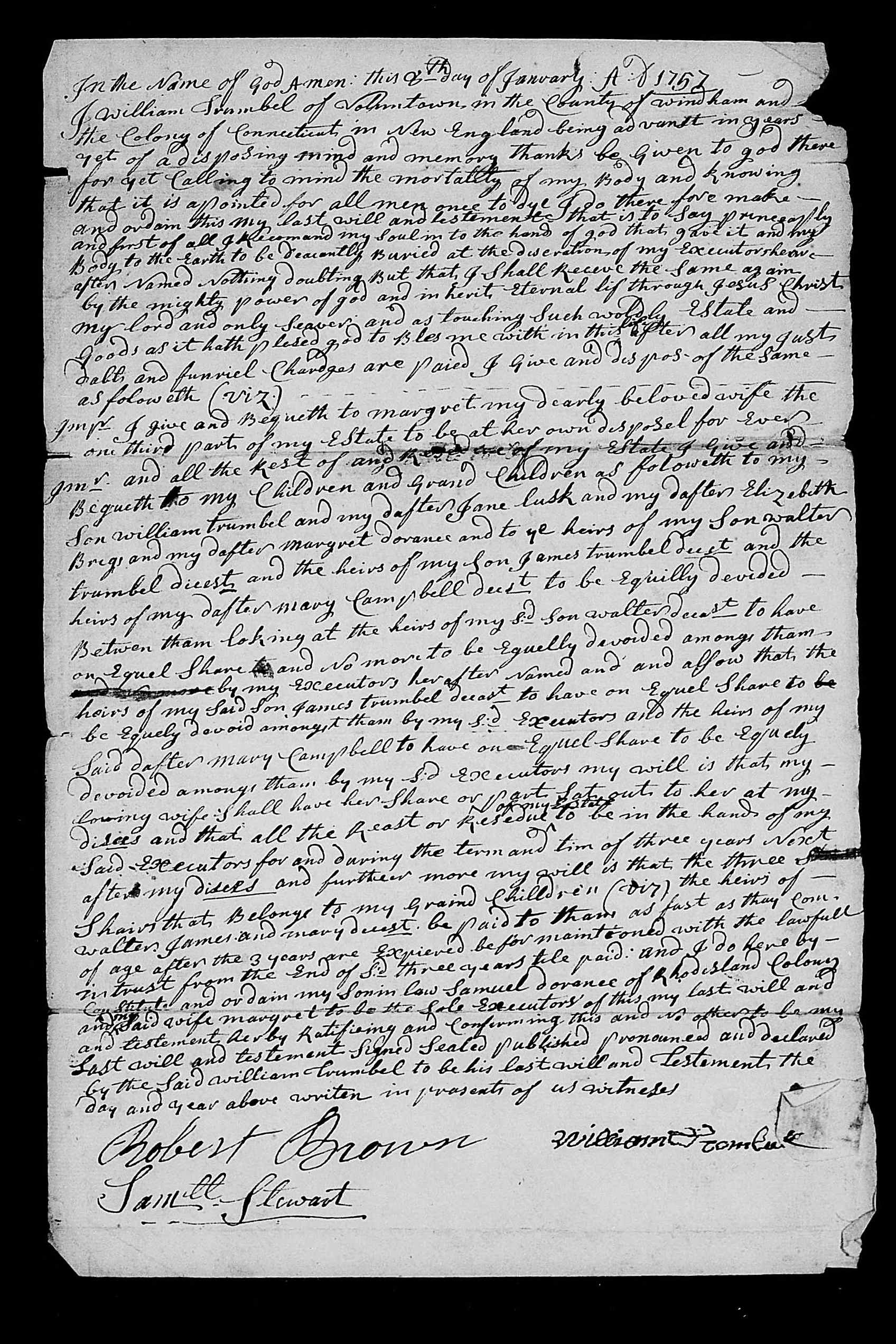 | Marriage | She married Walter Trumbull about 1736 in Voluntown, New London, Connecticut, USA. Jane Campbell was, age ~16, Walter Trumbull was, age ~24. |