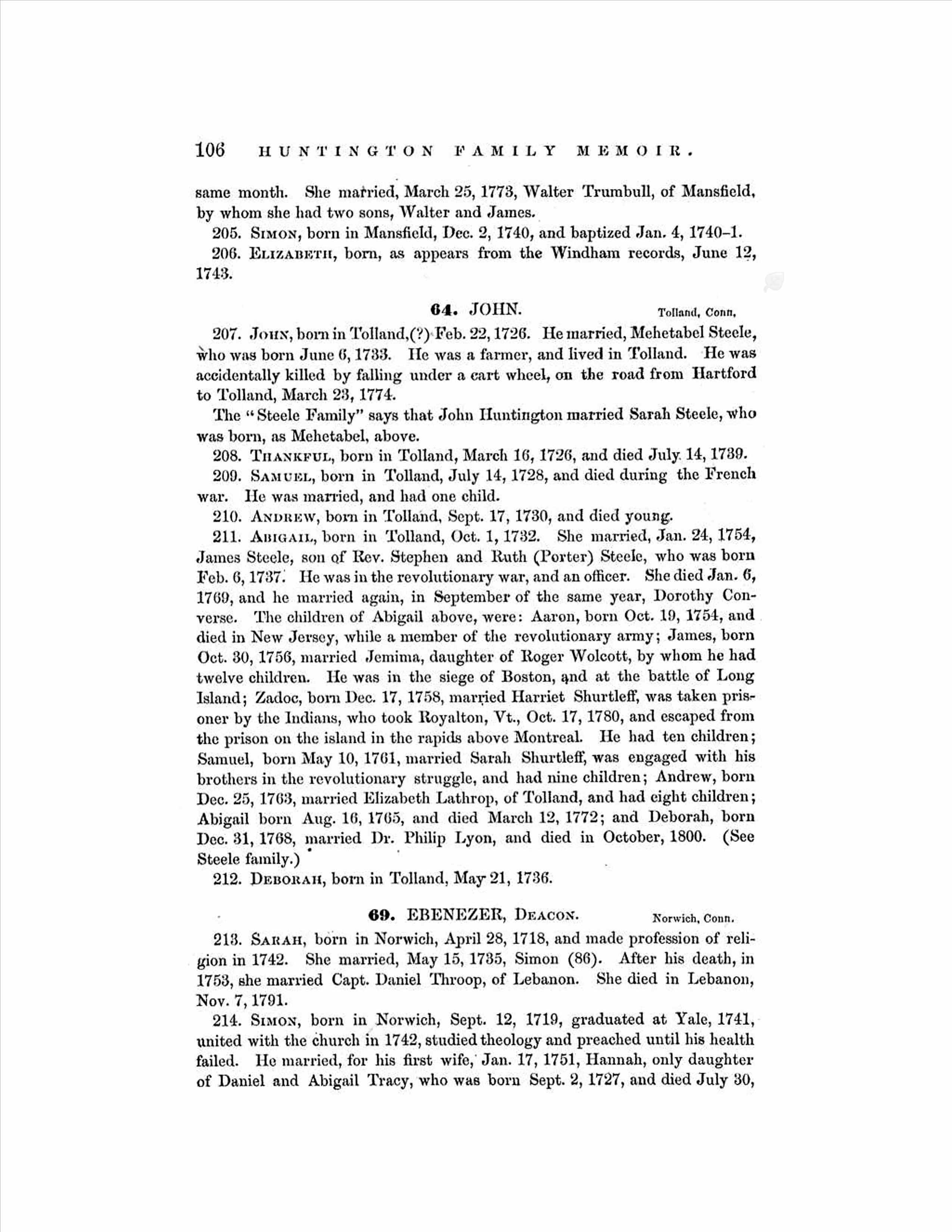 | Marriage | She married Walter Trumbull on 25 March 1773 in Mansfield, Connecticut, USA. Ruth Huntington was, age 34, Walter Trumbull was, age ~26.1,2,1,5,6,5,7 |