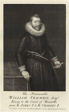 | Biography | Biography appears on. William Trumbull (1575?–1635) was an English diplomat, administrator and politician. From 1605 to 1625 Trumbull was secretary and later envoy from James I and then Charles I at the Brussels Court of Archduke Albert of Austria, ruler of the Habsburg Netherlands.[1]Trumbull also had an interest in music. Around 1595 he compiled a personally prepared collection of lute manuscripts that has become known as the Trumbull lute book, which shows he would have had access to the lute music of English court composers spanning much of the reign of Elizabeth I.[1]LifeHe was son of John Trumbull of Craven, Yorkshire, and his wife, Elizabeth Brogden or Briggden. He seems to have been introduced at court by Sir Thomas Edmondes. Early in James I's reign he was a court messenger, and probably he was attached to Edmondes's embassy to the Archduke Albert of Austria, regent of the Netherlands.When Edmondes was recalled from Brussels in 1609, Trumbull was promoted to succeed him as resident at the archduke's court, and retained the post for sixteen years, On 6 June 1611 he was instructed to demand the extradition of William Seymour and Arabella Stuart should they land in the archduke's dominions. On 17 February 1614, he was granted an ordinary clerkship to the privy council; a sinecure, given that Trumbull remained at his post at Brussels. In 1620 he protested against the Spanish invasion of the Palatinate.In 1624 he requested the reversion of one of the six clerks' places for himself and a clerkship of the privy seal for his eldest son. He was recalled in 1625 on the open rupture with Spain and on 16 February 1626 he was returned to parliament for Downton in Wiltshire. He assumed active duties as clerk of the privy council, devoting himself especially to naval matters.On 28 March 1629, he was granted Easthampstead Park, Berkshire, on condition of maintaining a deer-park for the king's recreation. Soon afterwards he was appointed muster-master-general. He died in London in September 1635, being succeeded as clerk to the council by his godson Edward Nicholas, and was buried in Easthampstead church, where a monument was erected to his memory.WorksTrumbull's correspondence is a source for the diplomatic history of the period; it was preserved in various archives.[2] Many of the letters were printed in Ralph Winwood's Memorials, and in Dudley Digges's Compleat Ambassador. While at Brussels Trumbull secured the private correspondence between Francisco de Vargas y Mexia and Cardinal Granvelle on the Council of Trent; an English translation was published in 1697 by Michael Geddes, and one in French by Michel Le Vassor in 1700.FamilyBy his wife Deborah, daughter of Walter Downes of Beltring, Kent, he left two sons and two daughters. The elder son, William (1594?–1668), was father of Sir William Trumbull.11 |