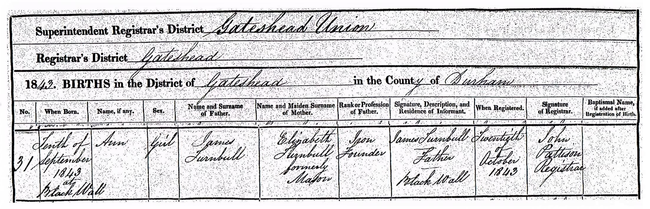 Ann Turnbull 1843 birth registration