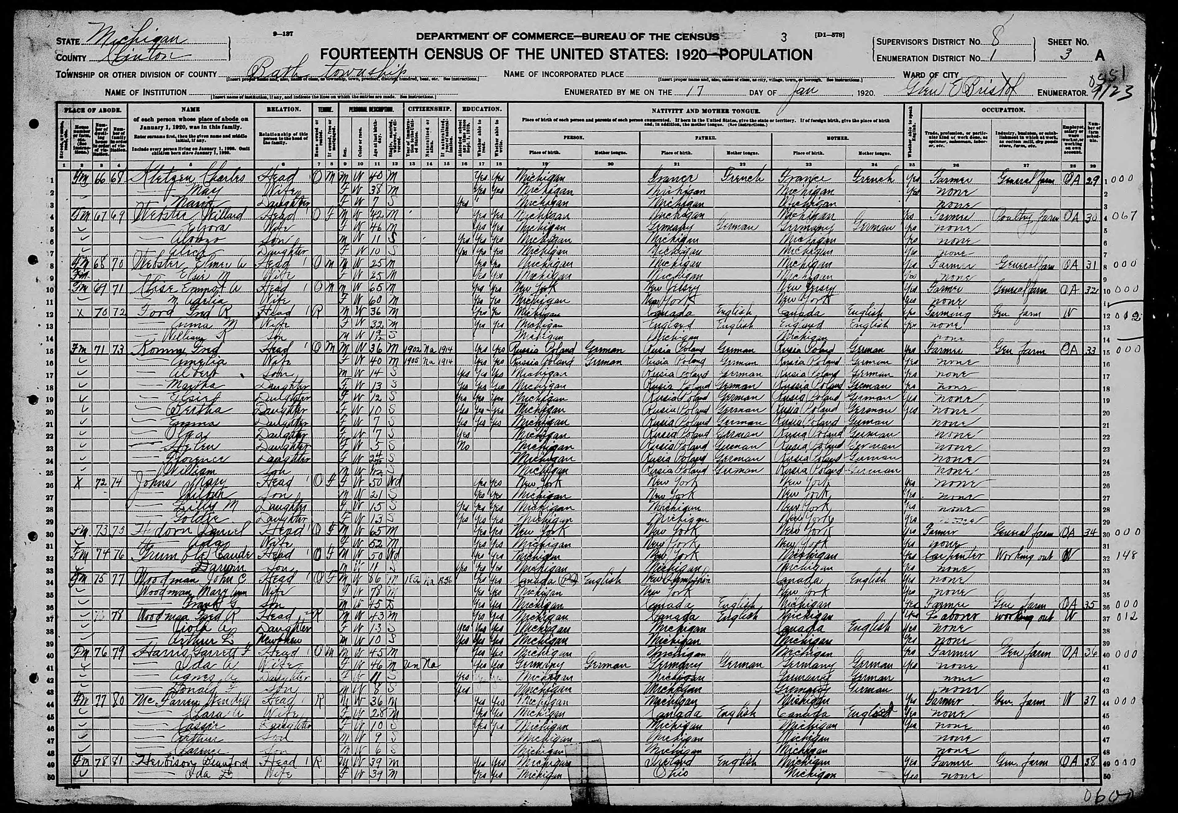 - [S1141] Ancestry.com, 1920 United States Federal Census (Name: Ancestry.com Operations Inc; Location: Provo, UT, USA; Date: 2010;), Year: 1920; Census Place: Bath, Clinton, Michigan; Roll: T625_761; Page: 3A; Enumeration District: 1
