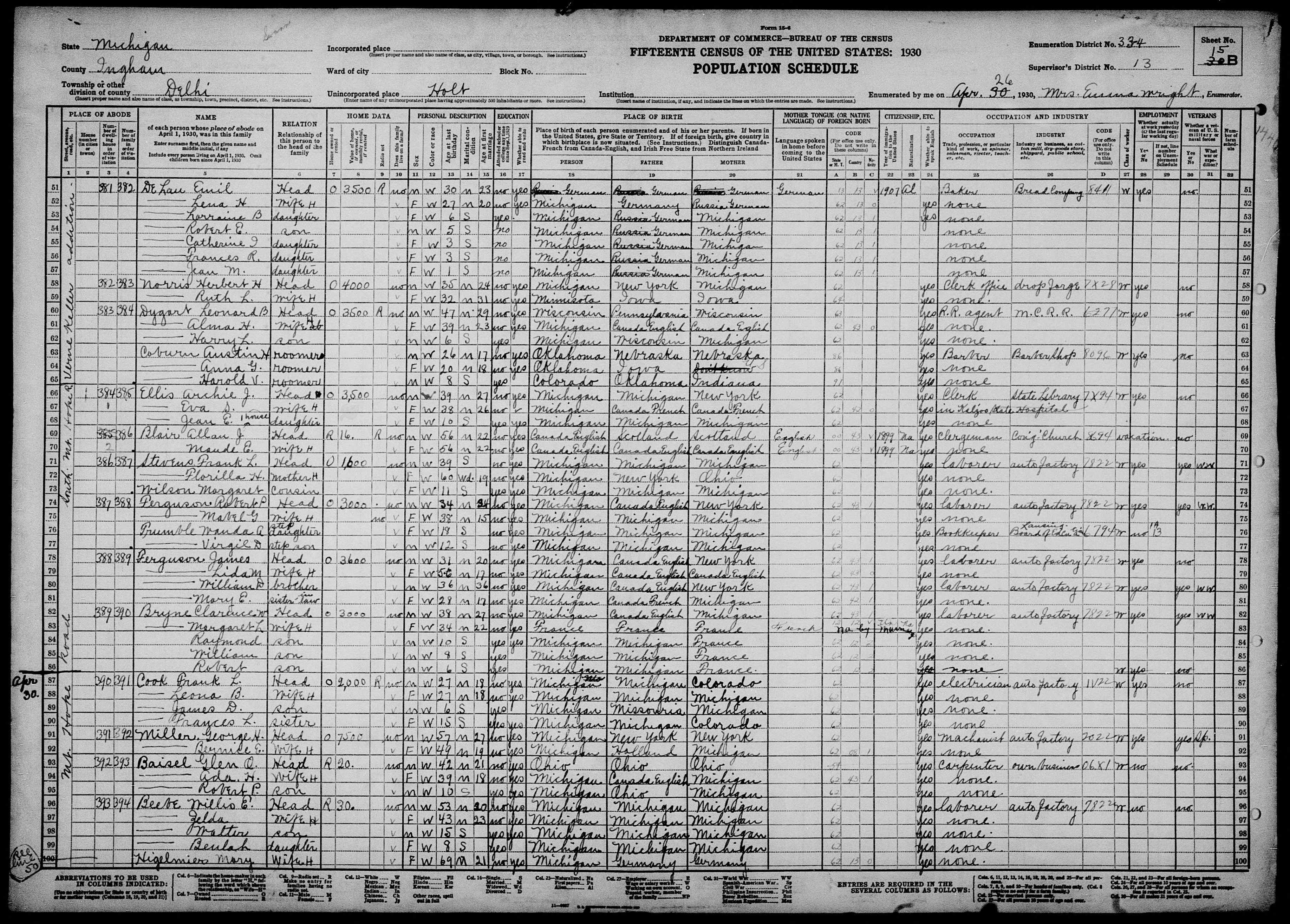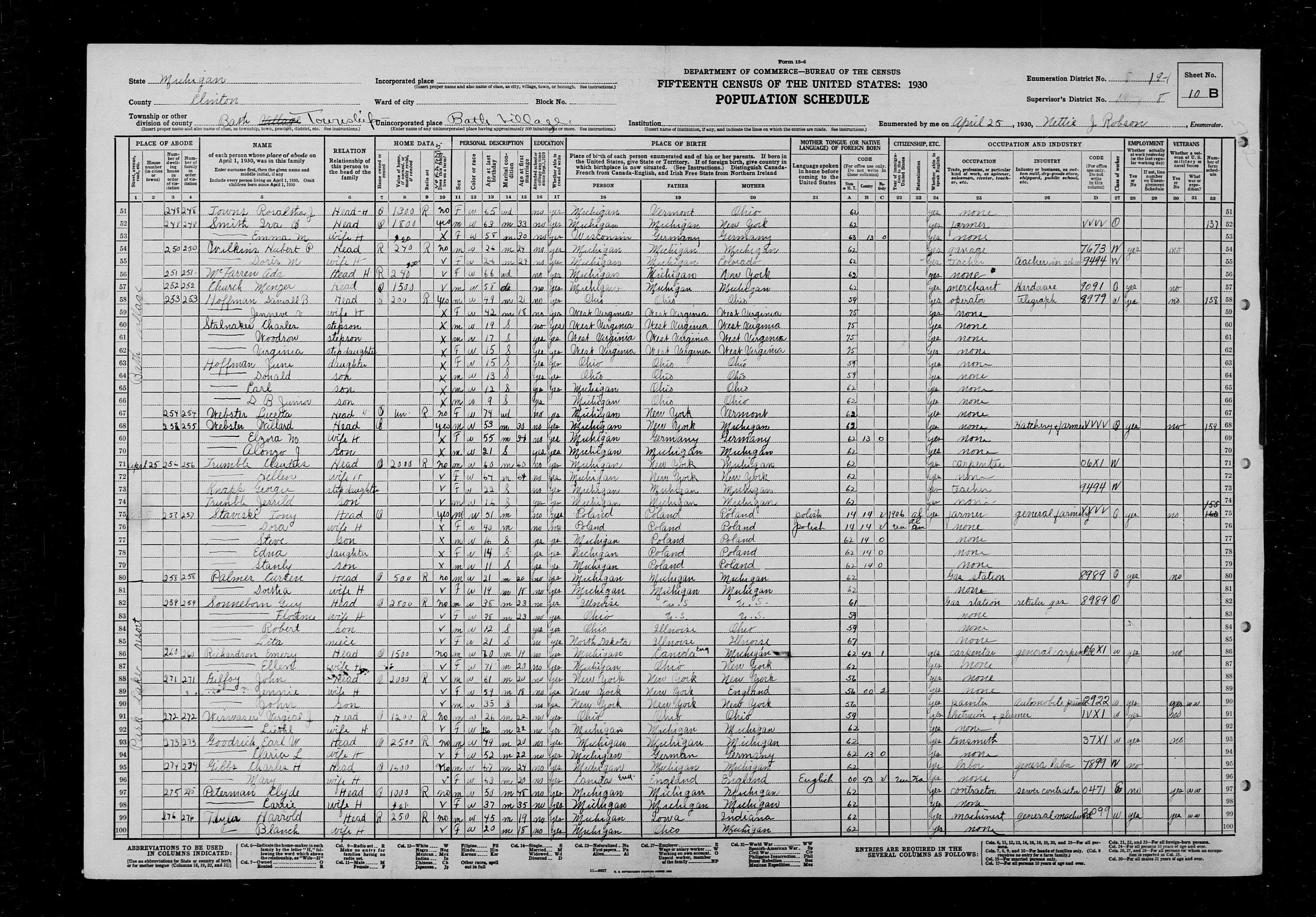 - [S1277] Ancestry.com, 1930 United States Federal Census, Year: 1930; Census Place: Bath, Clinton, Michigan; Page: 10B; Enumeration District: 0001; FHL microfilm: 2340716, United States of America, Bureau of the Census. Fifteenth Census of the United States, 1930. Washington, D.C.: National Archives and Records Administration, 1930. T626, 2,667 rolls.