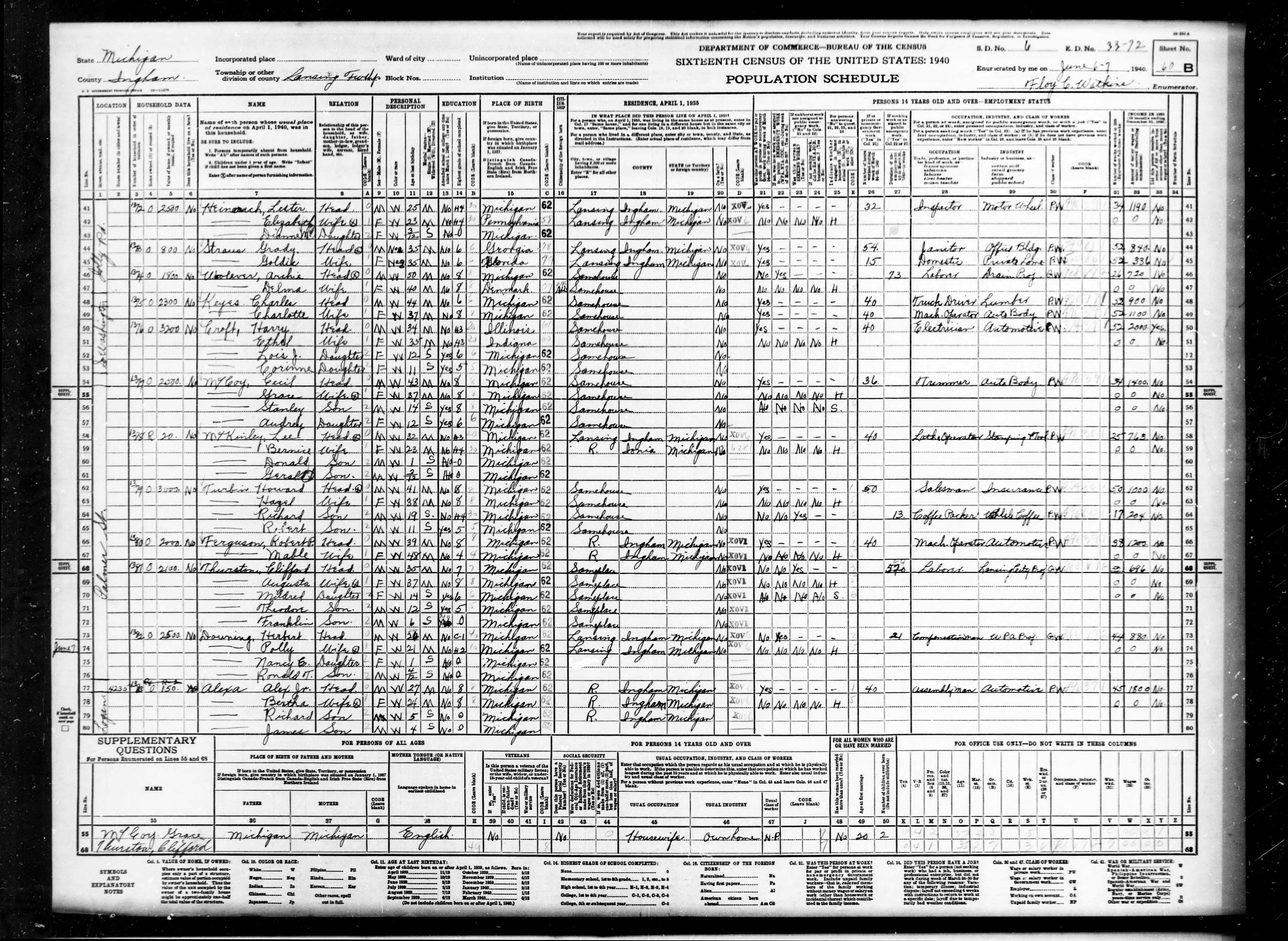 - [S1134] Ancestry.com, 1940 United States Federal Census (Name: Online publication - Provo, UT, USA: Ancestry.com Operations, Inc., 2012.Original data - United States of America, Bureau of the Census. Sixteenth Census of the United States, 1940. Washington, D.C.: National Archives and Records Administration, 1940. T627;), Year: 1940; Census Place: Lansing, Ingham, Michigan; Roll: m-t0627-01762; Page: 10A; Enumeration District: 33-58