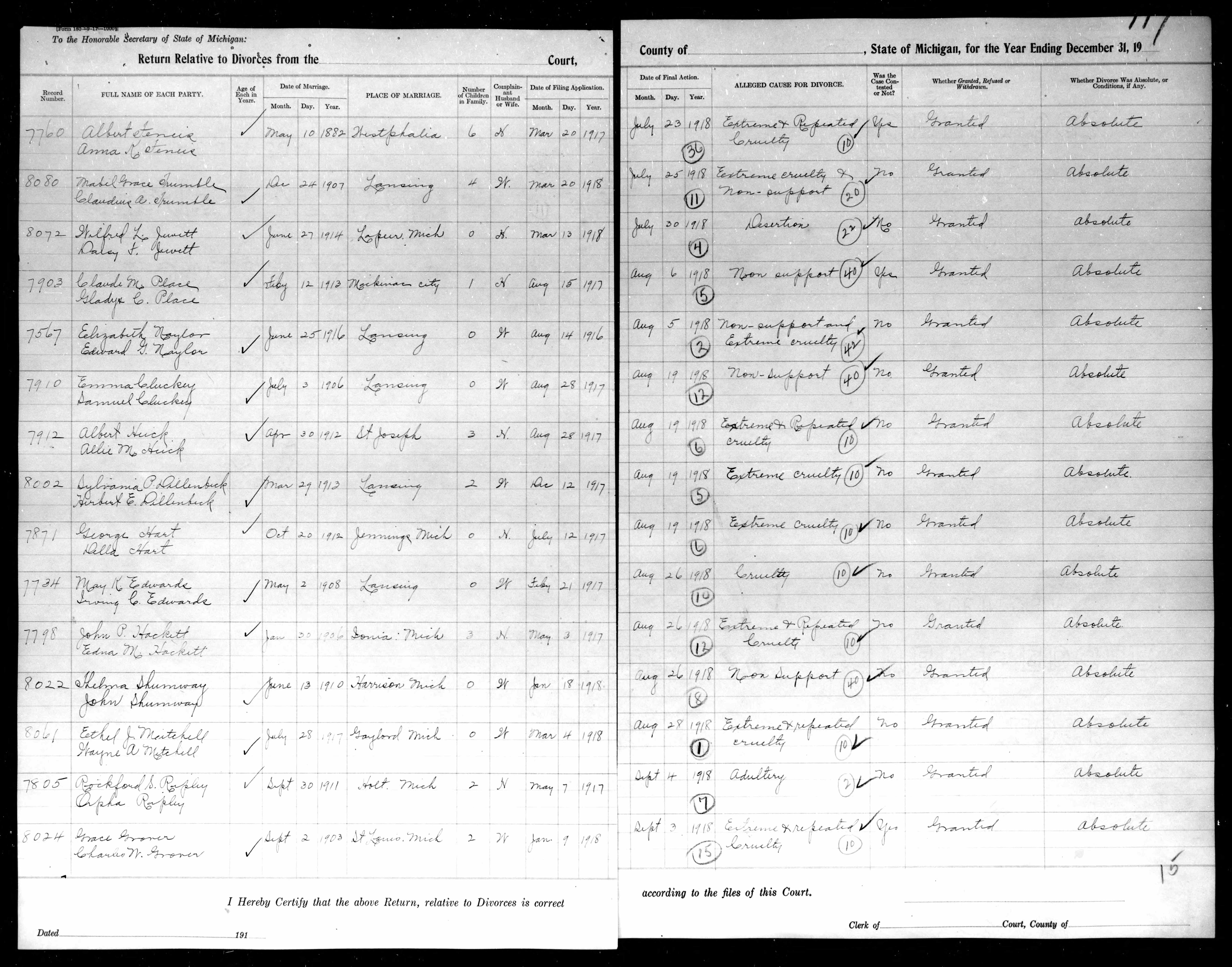 - [S1735] Ancestry.com, Michigan, U.S., Divorce Records, 1897-1952, Michigan Department of Community Health, Division for Vital Records and Health Statistics; Lansing, Michigan; Michigan. Divorce records,