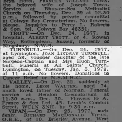 - [S1688] Ancestry.com, UK and Ireland, Newspapers.com™ Obituary Index, 1800s-current, The Daily Telegraph; Publication Date: 28 Dec 1977; Publication Place: London, Greater London, England; URL: https://www.newspapers.com/image/750611783/?article=bc10af0c-e35c-4206-95f6-3f46313e4bf6&focus=0.83681923,0.23444678,0.9586299,0.25510234&xid=3355, See newspaper information provided with each entry.