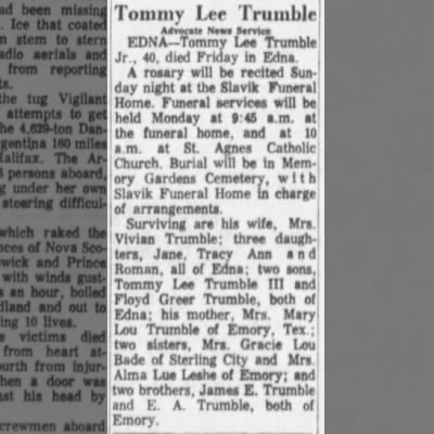 | Burial | Tommie Lee Trumble, Jr, was buried in Edna, Jackson County, Texas, United States of America.1 |