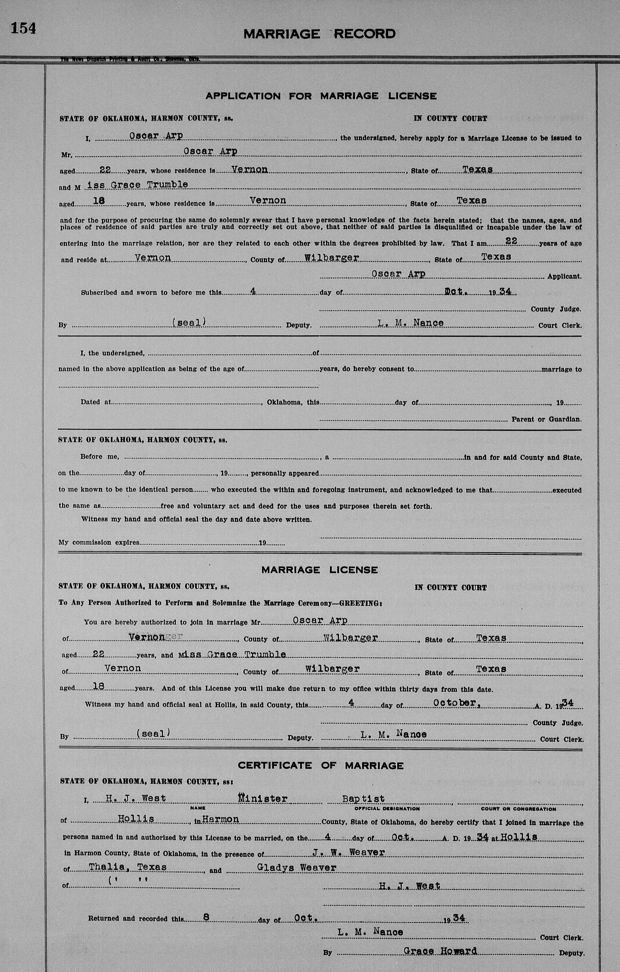 | Marriage | She married Oscar Colquit Arp on 4 October 1934 in Harmon, Oklahoma, USA. Grace Lou 'Gracie' Trumble was, age 14, Oscar Colquit Arp was, age ~22.8,8,9,9 |