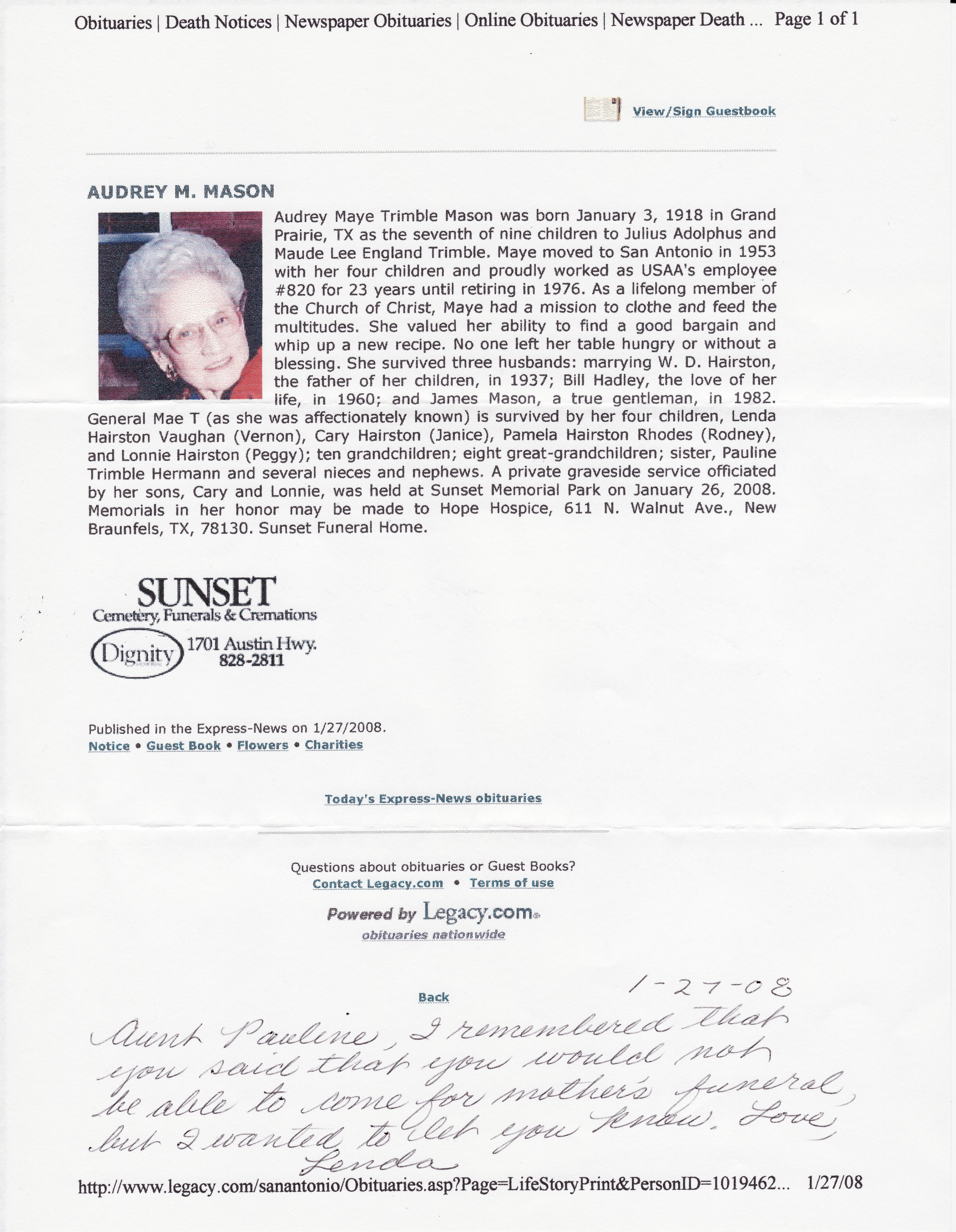 . - [S1839] Ancestry.com, Texas, U.S., Death Index, 1903-2000, Texas Department of Health. Texas Death Indexes, 1903-2000. Austin, TX, USA: Texas Department of Health, State Vital Statistics Unit.
