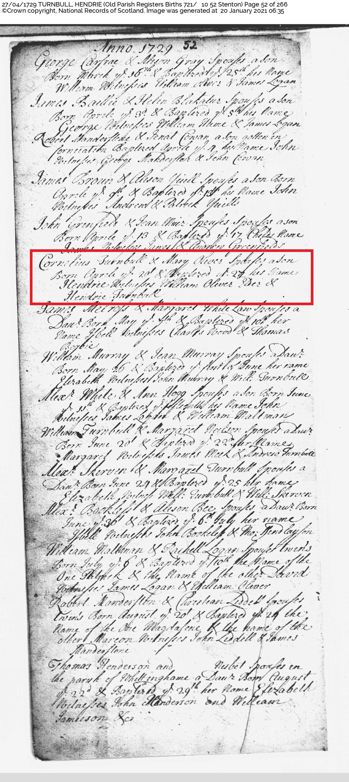 Certificate - Birth & Baptism - Turnbull, Henry - 1729