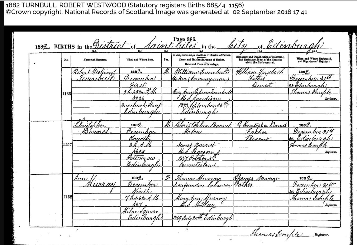 | Birth | Robert Westwood Turnbull was born on 1 December 1882 in 36, Buccleuch street, Edinburgh, Midlothian, Scotland.1,2,3,5 |