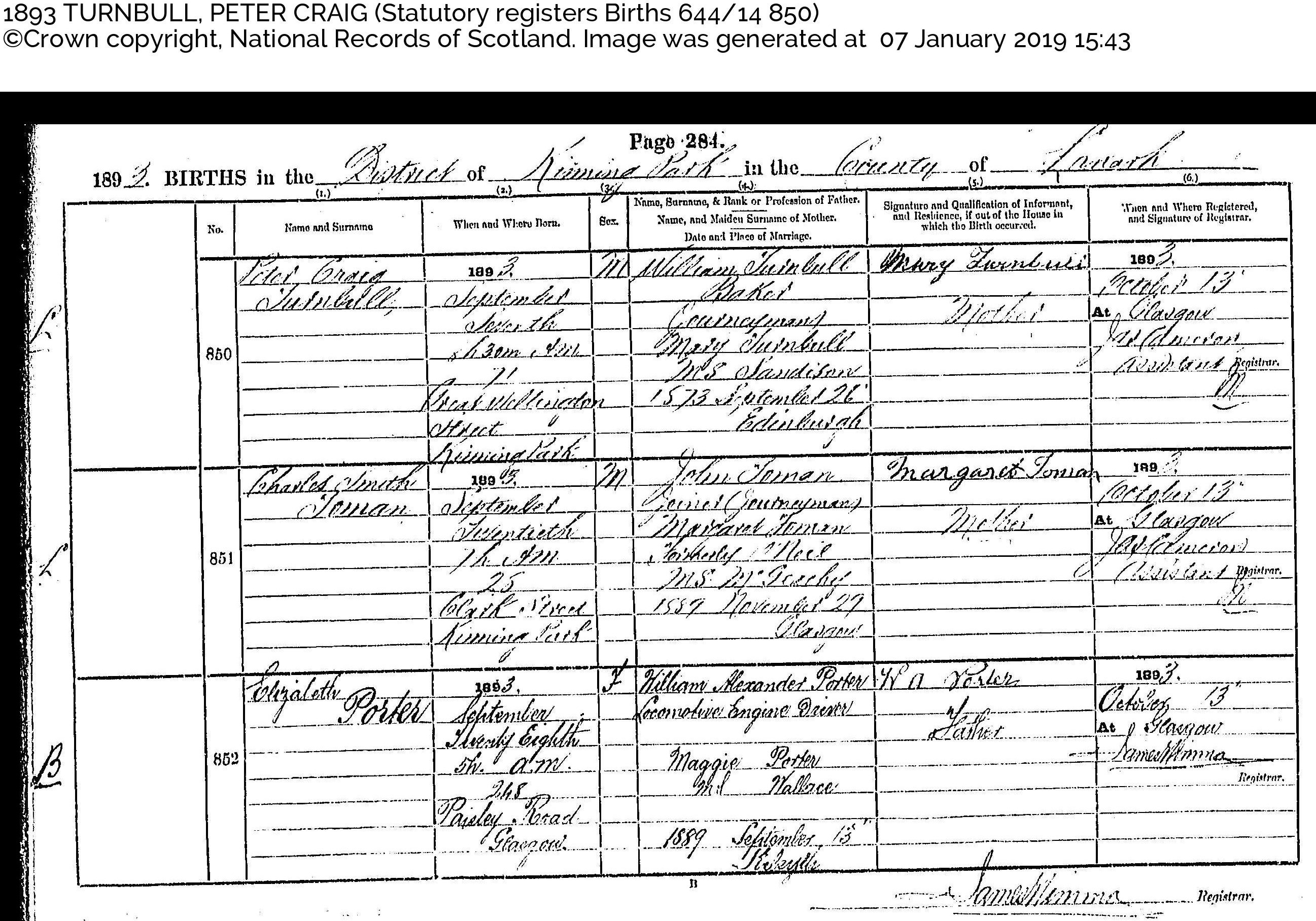| Birth | William Sandison Turnbull was born on 11 July 1874 in 26, Gifford Park Edinburgh, Scotland.1 |