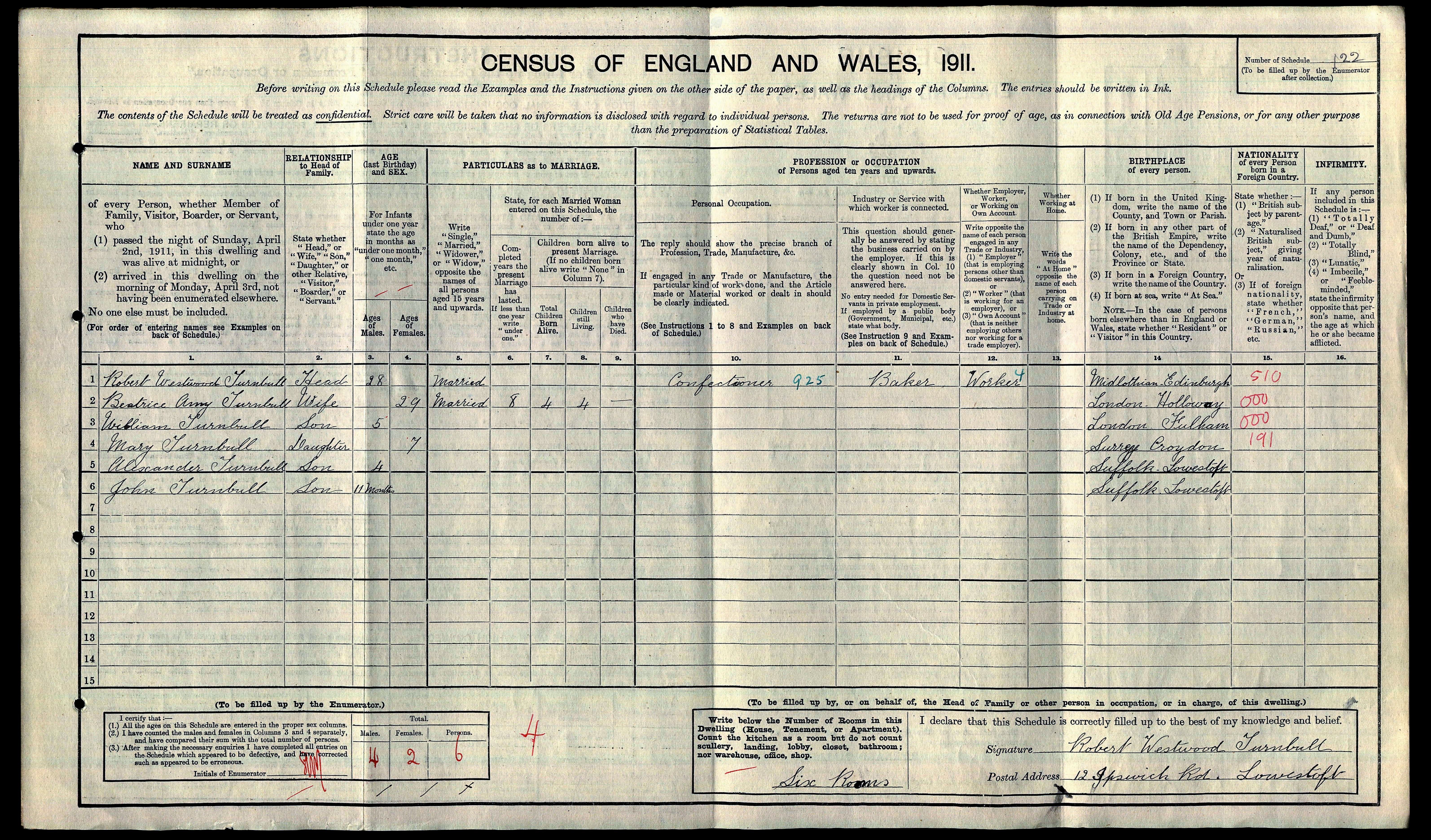 | Residence | William Turnbull lived Relation to Head of House: Son in Lowestoft, Suffolk, England, on 2 April 1911.1 |