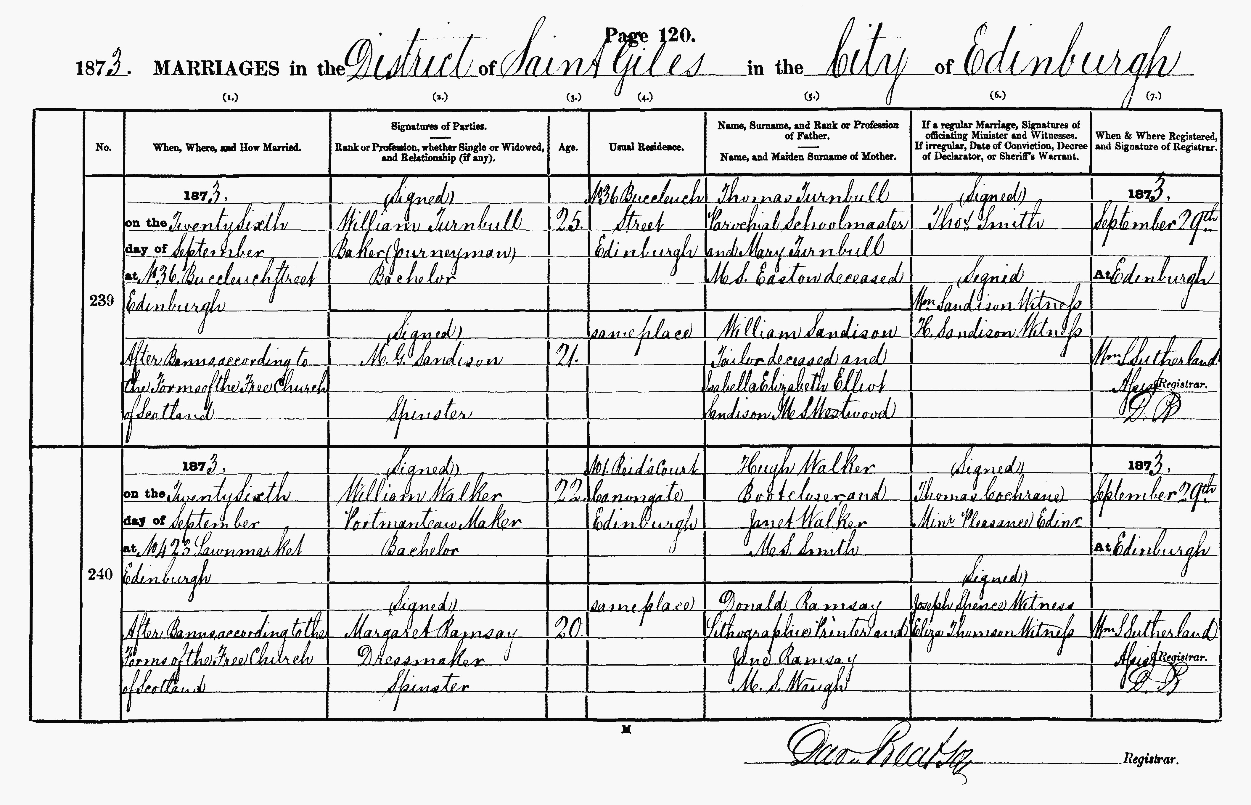 | Marriage | She married William Turnbull on 26 September 1873 in Edinburgh Parish, Edinburgh, Midlothian, Scotland. Mary Amy Gibson Sandison was, age ~20, William Turnbull was, age 25.2,2 |