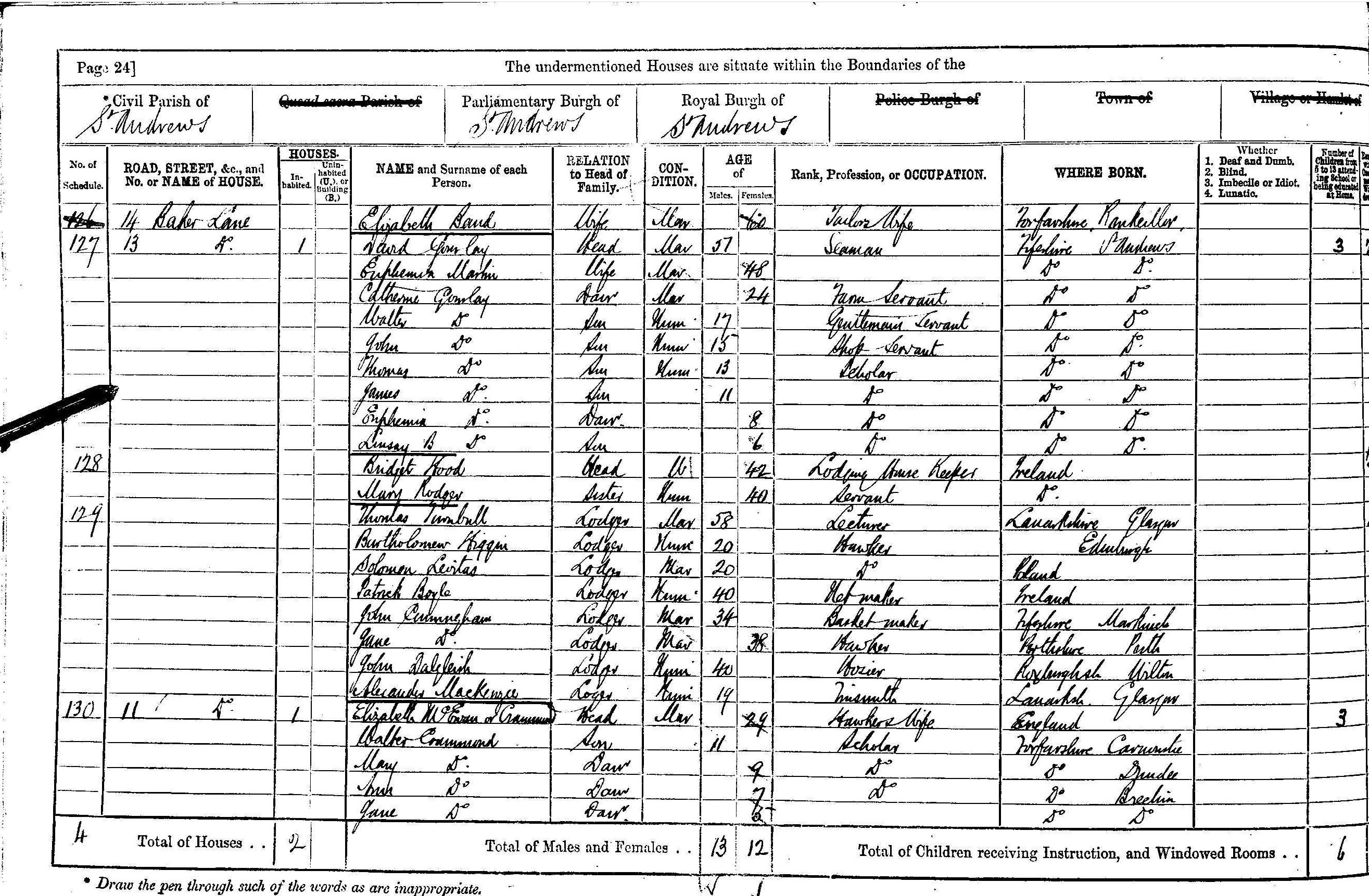 - [S1433] Ancestry.com, 1871 Scotland Census, Parish: St Andrews; ED: 3; Page: 24; Line: 13; Roll: CSSCT1871_78, Scotland. 1871 Scotland Census. Reels 1-191. General Register Office for Scotland, Edinburgh, Scotland.