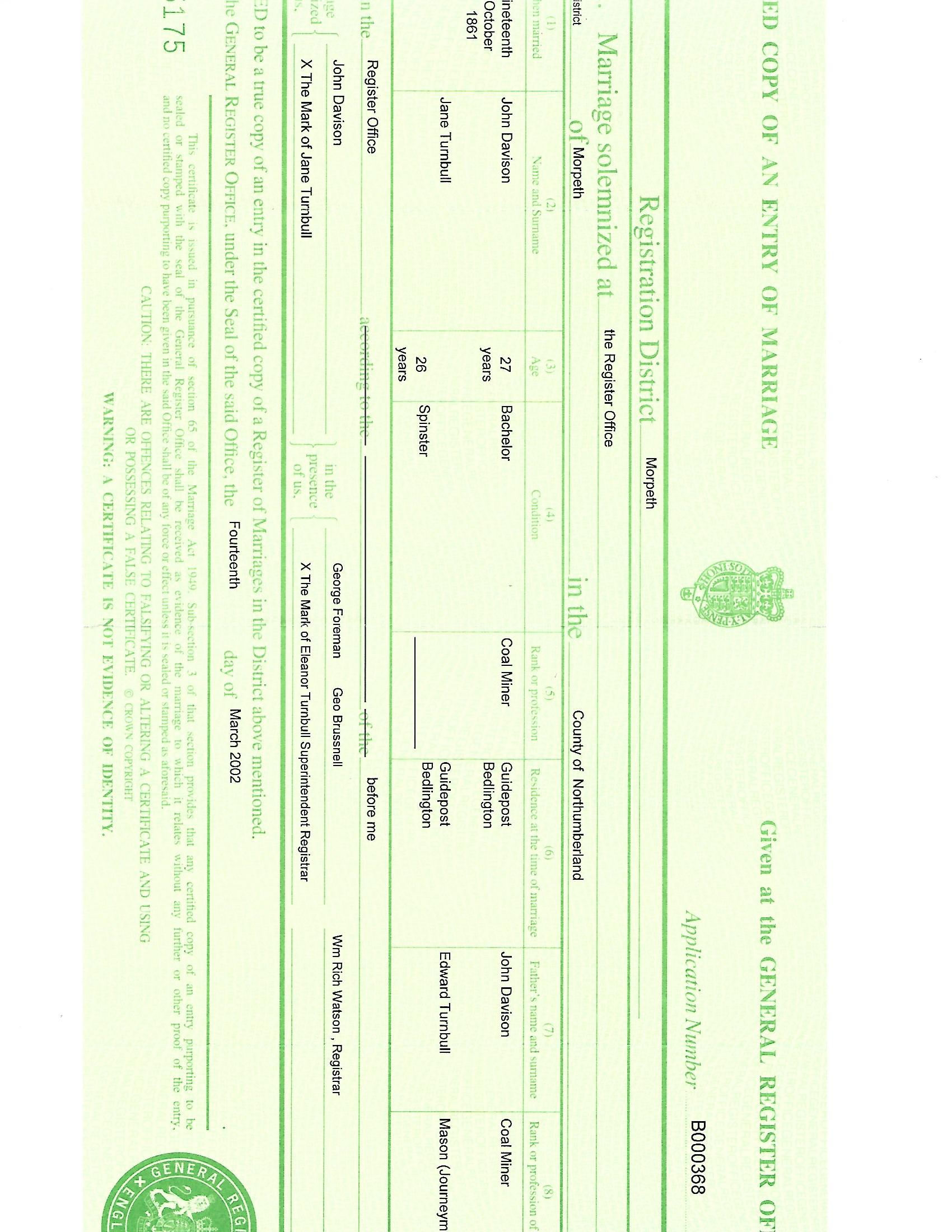 - [S1522] FreeBMD, England & Wales, Civil Registration Marriage Index, 1837-1915, General Register Office. England and Wales Civil Registration Indexes. London, England: General Register Office. © Crown copyright. Published by permission of the Controller of HMSO and the Office for National Statistics. You must not copy on, transfer or reproduce records without the prior permission of ONS. Database Copyright © 1998-2003 Graham Hart, Ben Laurie, Camilla von Massenbach and David Mayall.