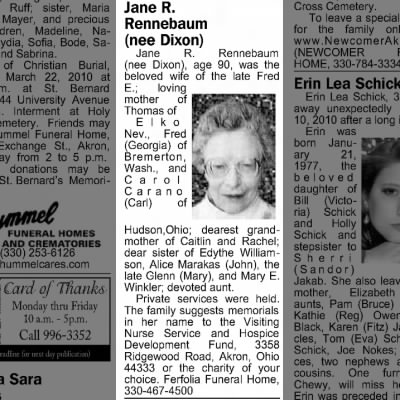 - [S1191] Ancestry.com, U.S., Obituary Collection, 1930-Current (Name: Ancestry.com Operations Inc; Location: Lehi, UT, USA; Date: 2006;), Akron Beacon Journal; Publication Date: 21/ Mar/ 2010; Publication Place: Akron, Ohio, USA; URL: http://www.legacy.com/obituaries/ohio/obituary.aspx?n=jane-r-rennebaum-dixon&pid=140926572