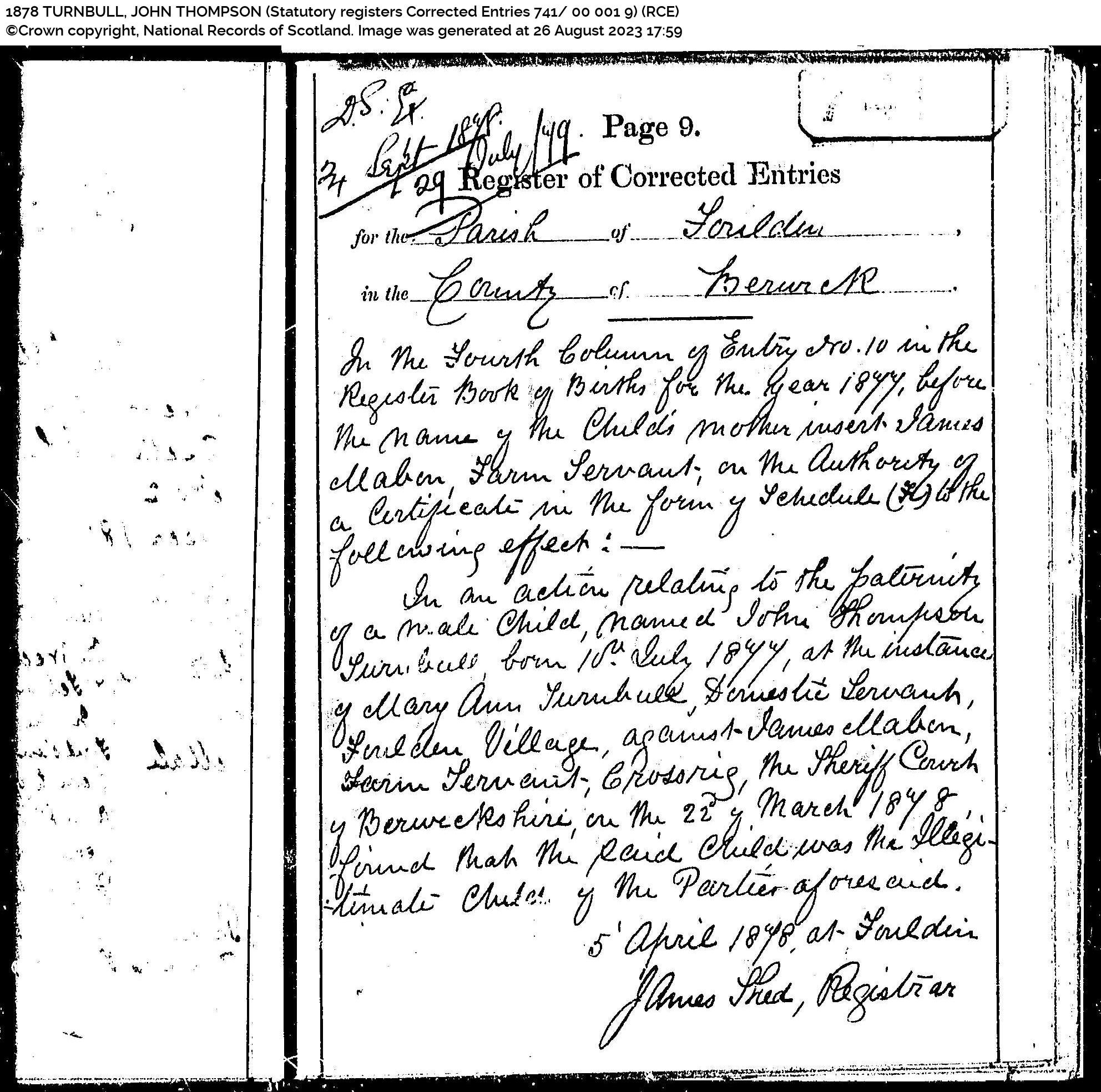 1878 TURNBULL, JOHN THOMPSON (Statutory registers Corrected Entries 741 00 001 9) (RCE) (ScotlandsPeople)