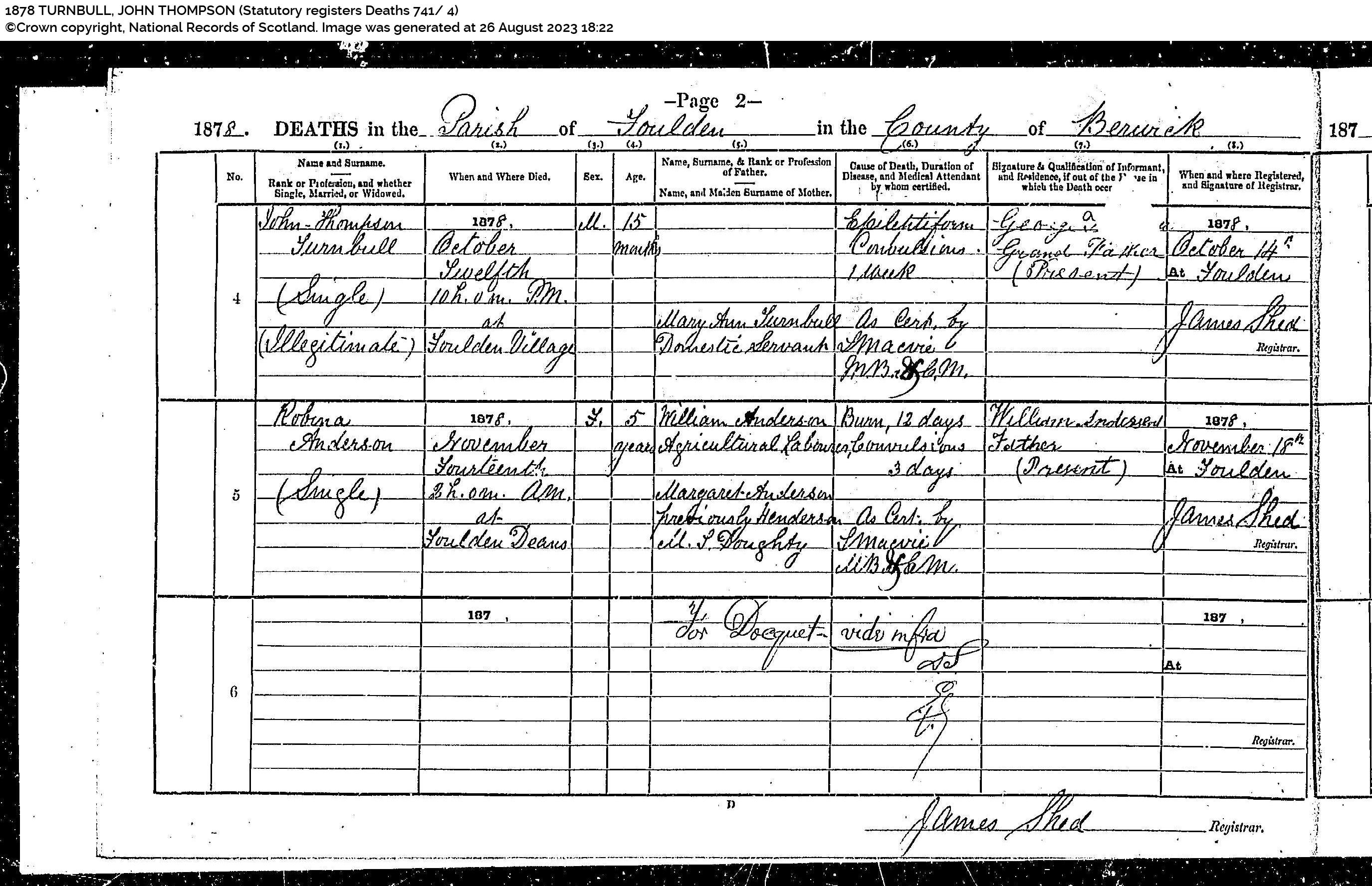 1878 TURNBULL, JOHN THOMPSON (Statutory registers Deaths 741 4) (ScotlandsPeople)