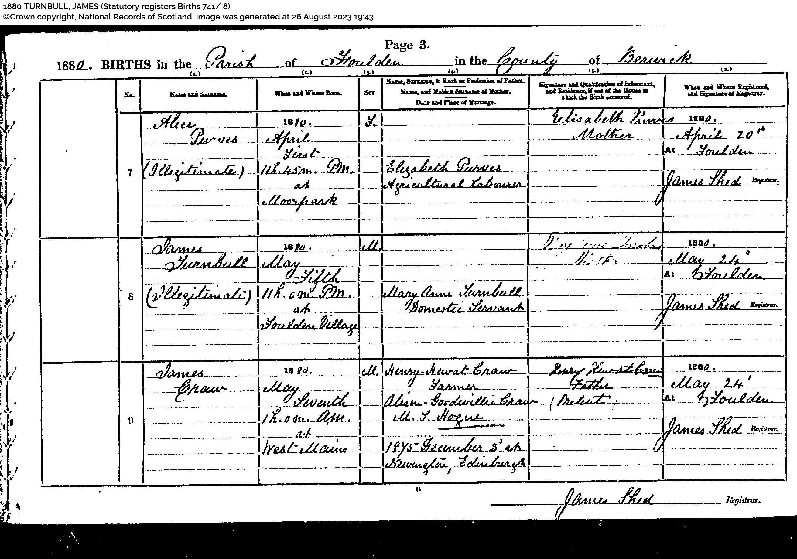 1880 TURNBULL, JAMES (Statutory registers Births 741 8) (ScotlandsPeople)