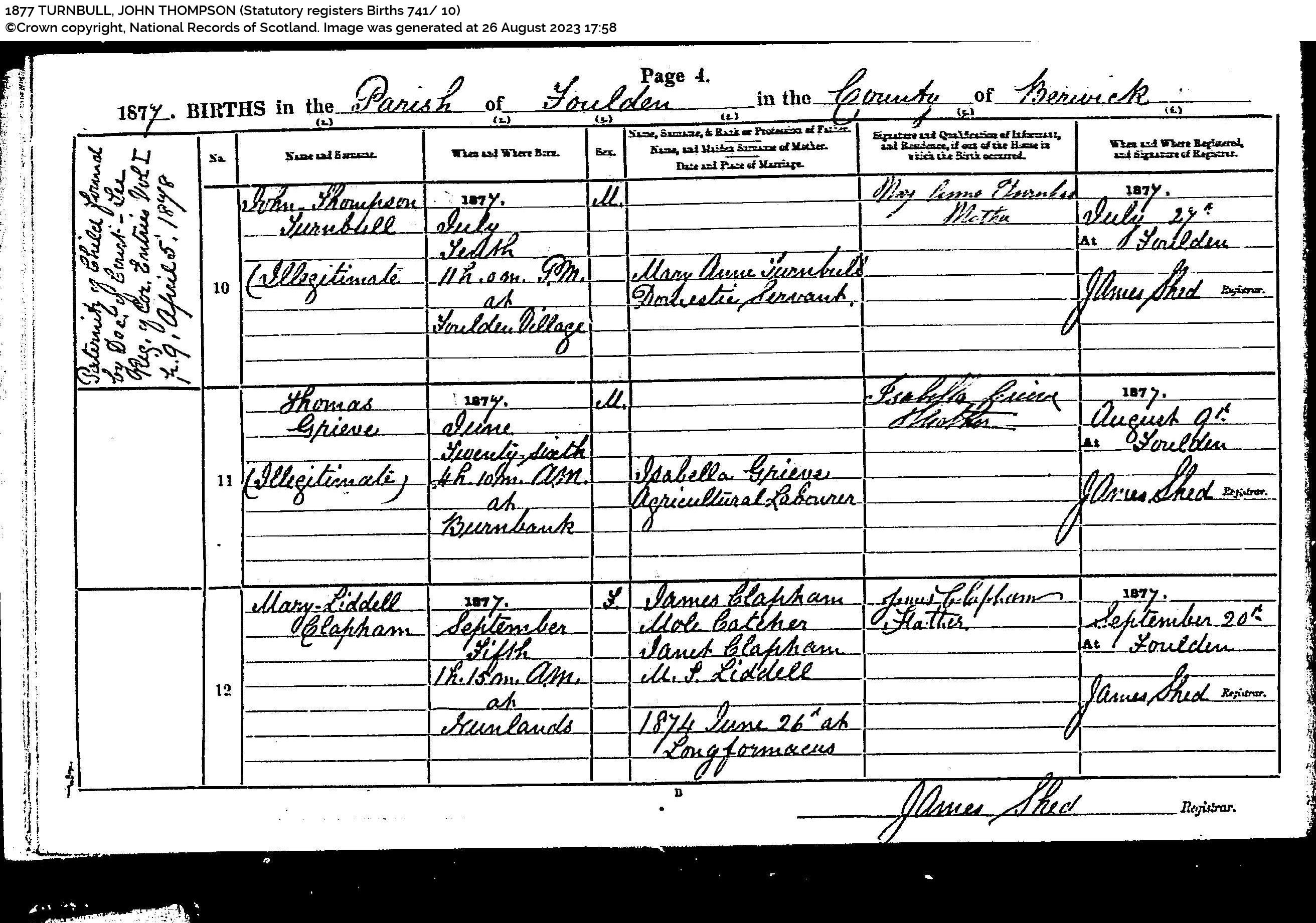 1877 TURNBULL, JOHN THOMPSON (Statutory registers Births 741 10) (ScotlandsPeople)