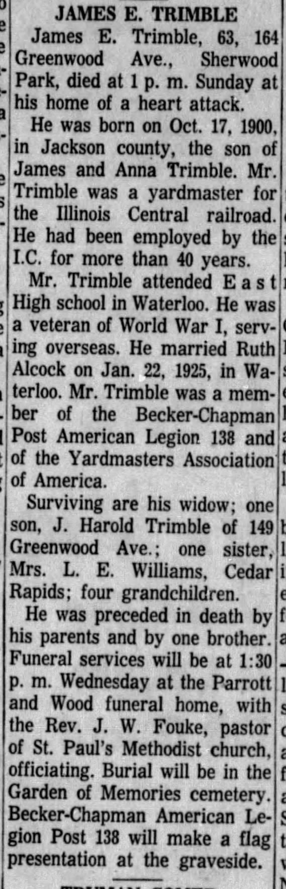| Burial | James Elton Trimble was buried in Waterloo, Black Hawk County, Iowa, United States of America.3,5 |