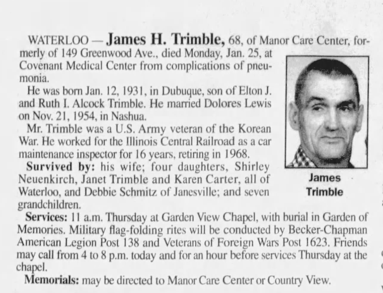 - [S1280] Ancestry.com, U.S., Obituary Collection, 1930-Current, Publication Date: 20/ Mar/ 2022; Publication Place: Waterloo, Iowa, USA; URL: https://www.legacy.com/us/obituaries/wcfcourier/name/dolores-trimble-obituary?id=33724044, See newspaper information provided with each entry.