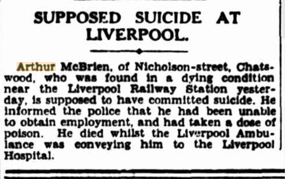 Death of Arthur McBrien, SMH 29 Nov 1929