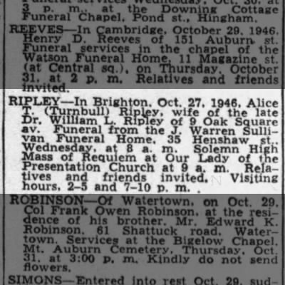 - [S1187] Ancestry.com, U.S., Newspapers.com Obituary Index, 1800s-current (Name: Ancestry.com Operations Inc; Location: Lehi, UT, USA; Date: 2019;), The Boston Globe; Publication Date: 2 May 1934; Publication Place: Boston, Massachusetts, USA; URL: https://www.newspapers.com/image/431706159/?article=7100190b-7668-406f-a98b-27d20e8c3c14&focus=0.13867143,0.48846376,0.25902537,0.71141857&xid=3355.
