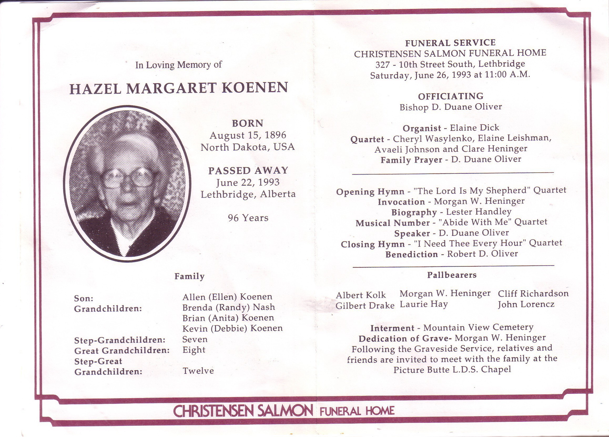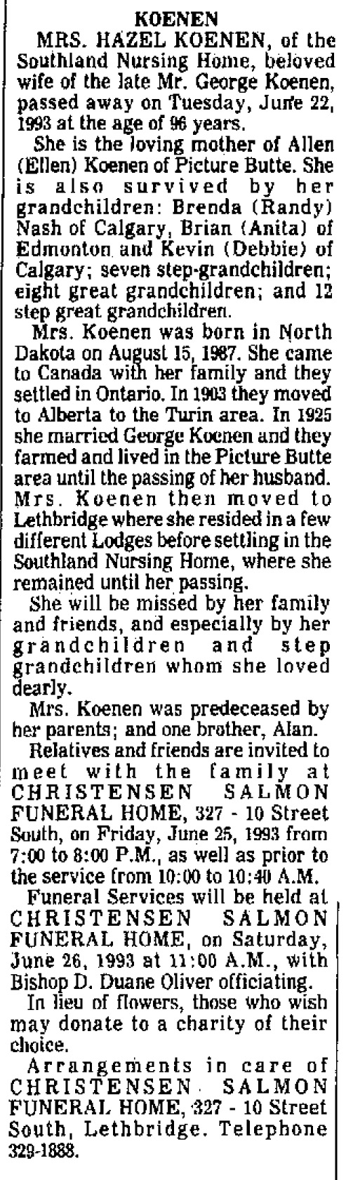 | Burial | Allen Roy Koenen was buried in Iron Springs, Lethbridge Census Division, Alberta, Canada.2 |