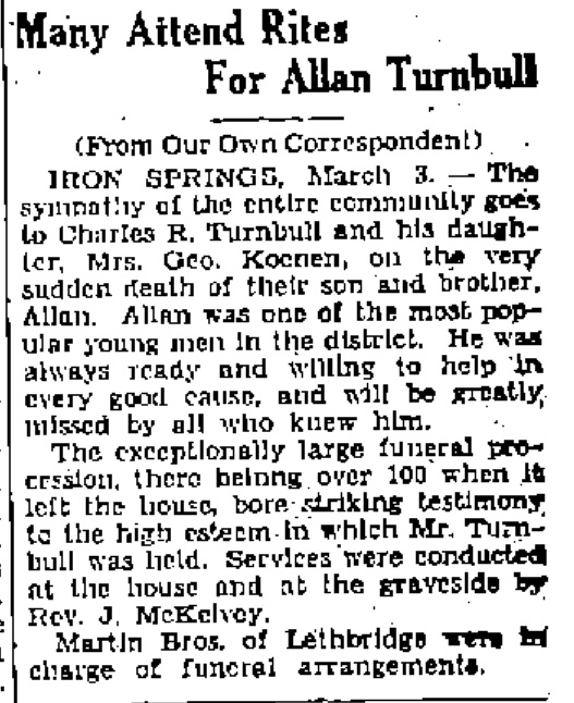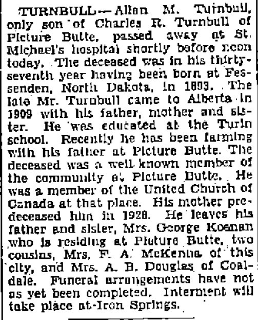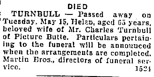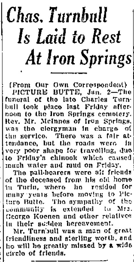 | Burial | Charles Rann Turnbull was buried in Iron Springs, Lethbridge Census Division, Alberta, Canada.8 |
