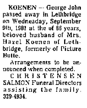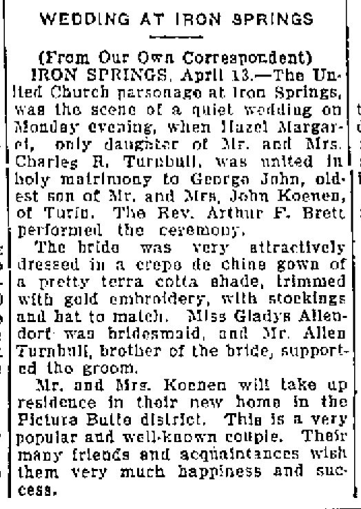 | Marriage | He married Hazel Margaret Turnbull on 12 April 1926 in Iron Springs, Lethbridge, Alberta, Canada. George John Koenen was, age 30, Hazel Margaret Turnbull was, age 28. |