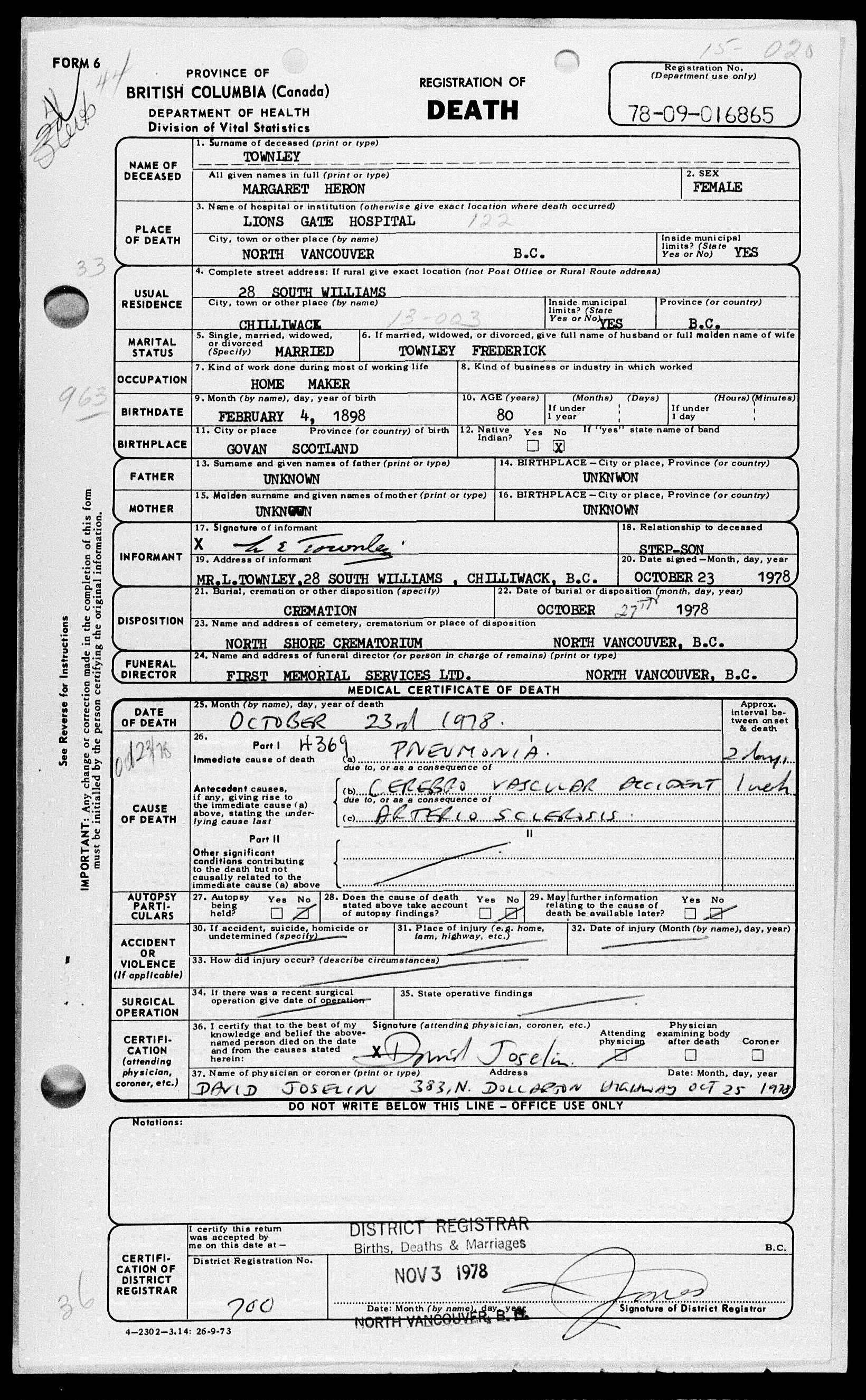 Death registration: Margaret Heron TOWNLEY née DOW