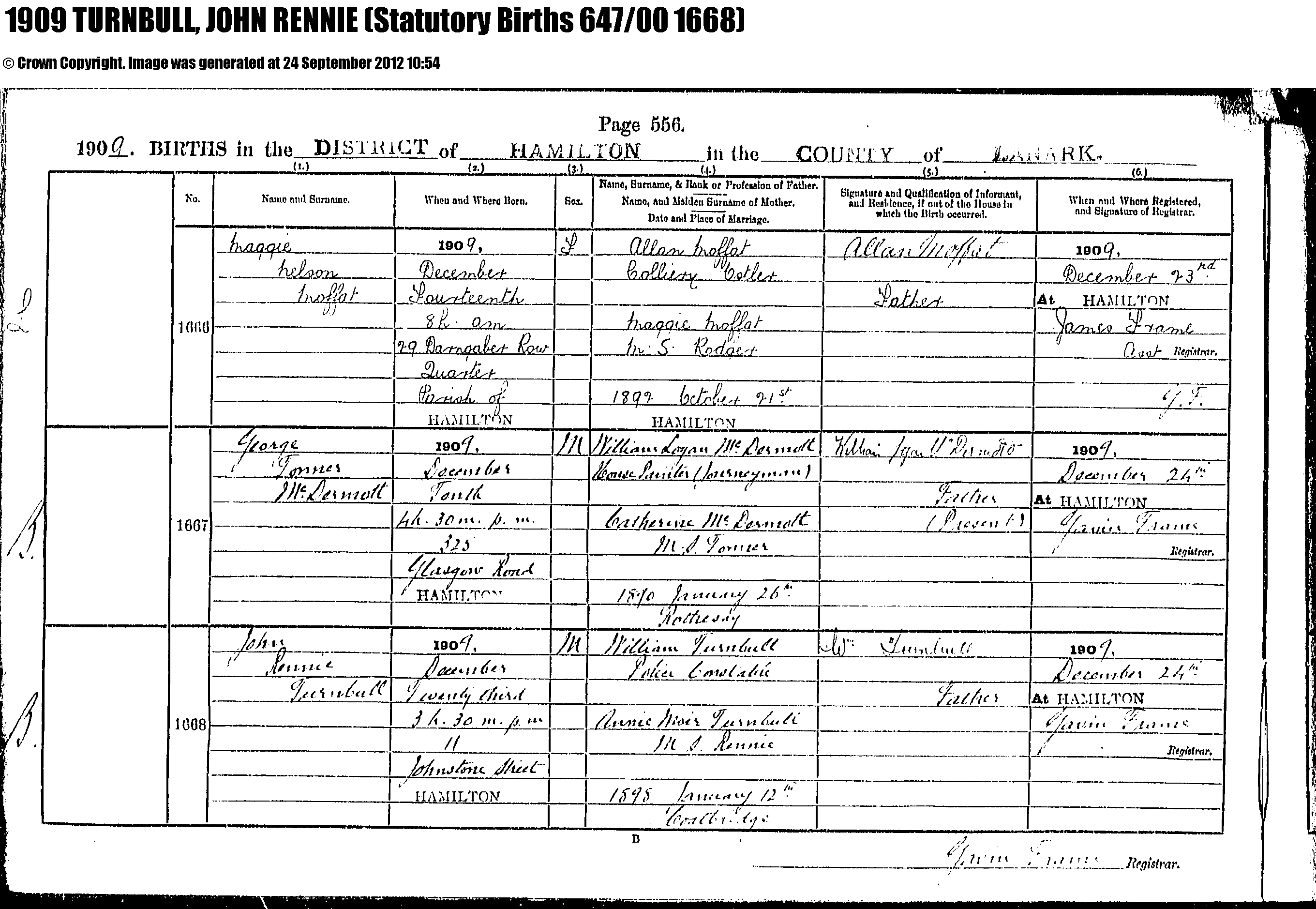 | Birth | John Rennie Turnbull was born on 23 December 1909 in 11 Johnstone Street, Hamilton, Lanarkshire. |