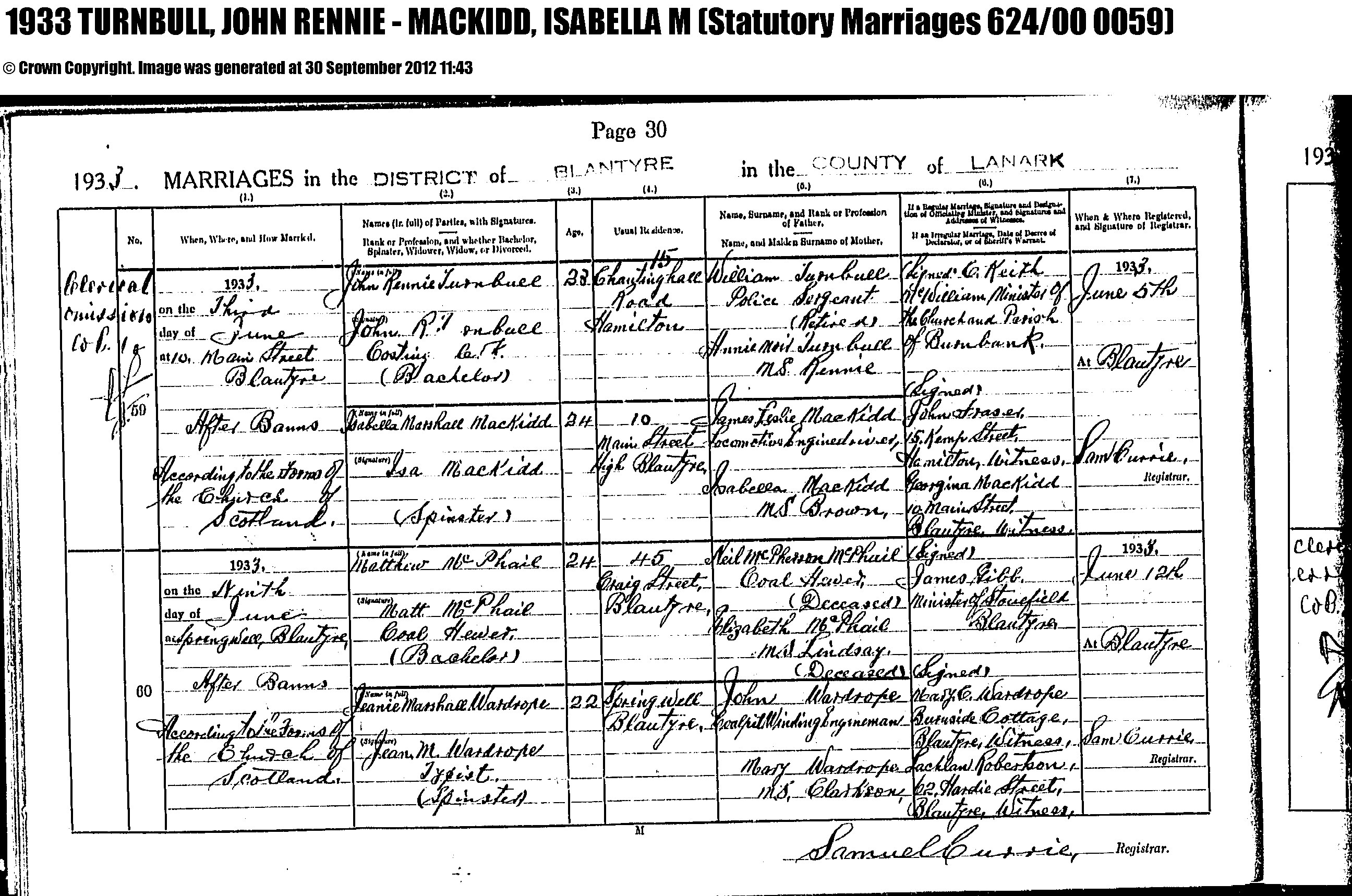 Marriage Record John Rennie Turnbull:Isabella Marshall Mackidd 1933
