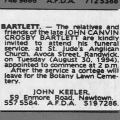 - [S1552] Ancestry.com, Australia and New Zealand, Newspapers.com™ Obituary Index, 1800s-current, The Sydney Morning Herald; Publication Date: 27 Aug 1994; Publication Place: Sydney, New South Wales, Australia; URL: https://www.newspapers.com/image/122387234/?article=b717db39-05ff-4e8c-8710-7fb6949e1285&focus=0.37339017,0.18112971,0.4578884,0.23378462&xid=3355, See newspaper information provided with each entry.