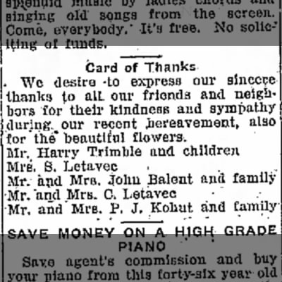 | Marriage | He married Mary Elisabeth Letavecz on 24 February 1913 in Greeley, Weld, Colorado, USA. Charles Harry Trimble was, age 34, Mary Elisabeth Letavecz was, age ~25.2 |