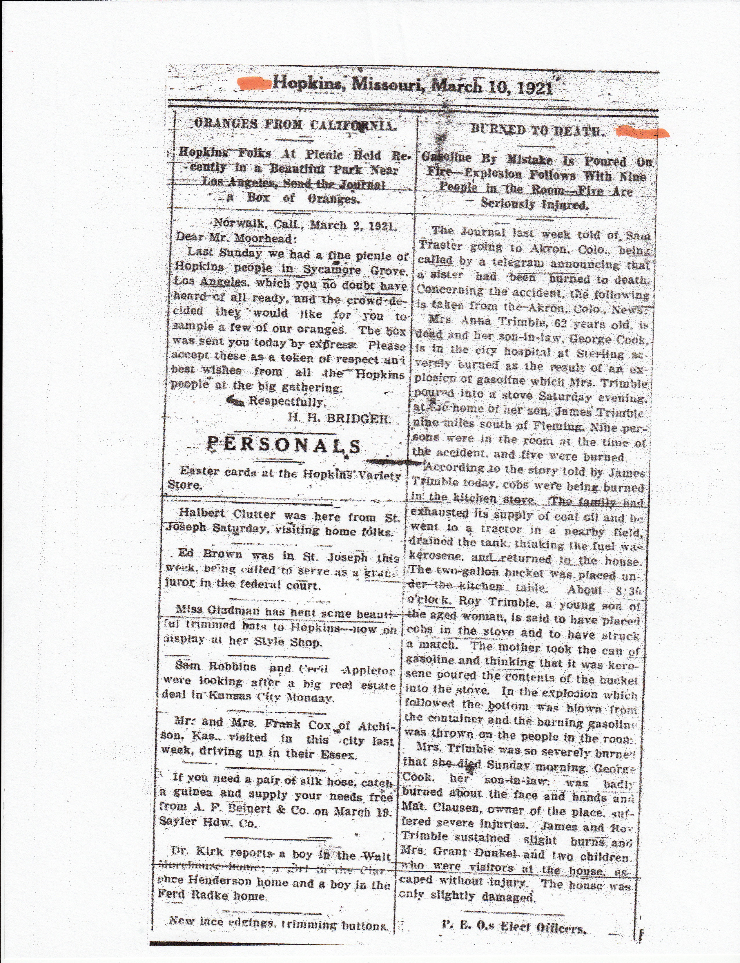 | Marriage | He married Nora Redman about 1915 in USA. John Harley Trimble (twin of James Arley), (Twin), was, age ~27, Nora Redman was, age ~21. |