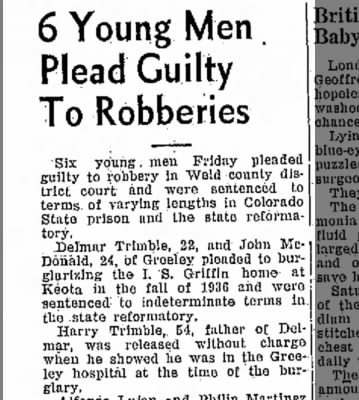 | Divorce | John Harley Trimble (twin of James Arley), (Twin), and Nora Redman were divorced on 4 August 1914 in Weld, Colorado, USA.3 |