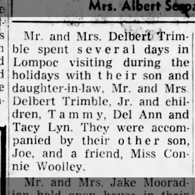 - [S1296] Ancestry.com, U.S., Newspapers.com™ Birth Index, 1800s-2003, The Lompoc Record; Publication Date: 22/ Dec/ 1970; Publication Place: Lompoc, California, USA; URL: https://www.newspapers.com/image/540354276/?article=b9a69c25-d4d2-41a3-8300-65d49b8ddfaf&xid=5905&terms=Delbert_E_Trimble, See newspaper information provided with each entry.