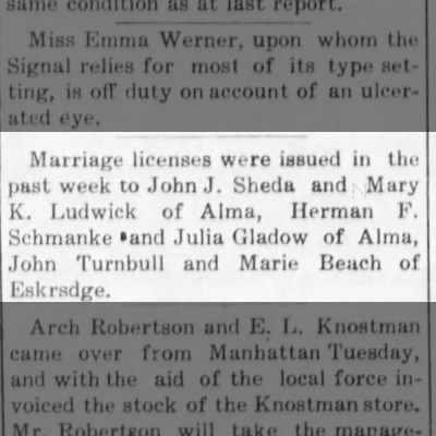 - [S1258] Ancestry.com, U.S., Newspapers.com™ Marriage Index, 1800s-current, The Frankfort Index; Publication Date: 6/ Aug/ 1970; Publication Place: Frankfort, Kansas, USA; URL: https://www.newspapers.com/image/346771452/?article=1c8fe779-5ed4-4341-8549-b9114906d1b8&focus=0.5798999,0.026400184,0.96575105,0.44557995&xid=3398, See newspaper information provided with each entry.
