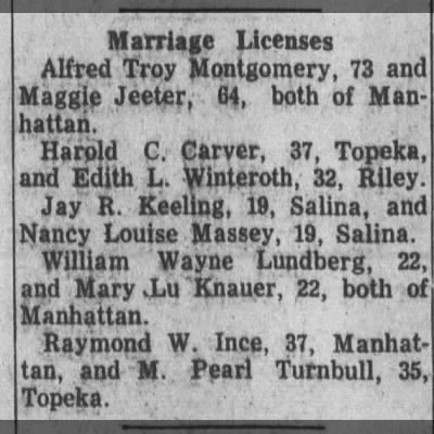 - [S1258] Ancestry.com, U.S., Newspapers.com™ Marriage Index, 1800s-current, The Manhattan Mercury; Publication Date: 1/ Nov/ 1953; Publication Place: Manhattan, Kansas, USA; URL: https://www.newspapers.com/image/423646988/?article=2c3c2163-03a7-4da4-9ce9-1a0128310980&focus=0.16275056,0.7083172,0.2793863,0.73596174&xid=3398, See newspaper information provided with each entry.