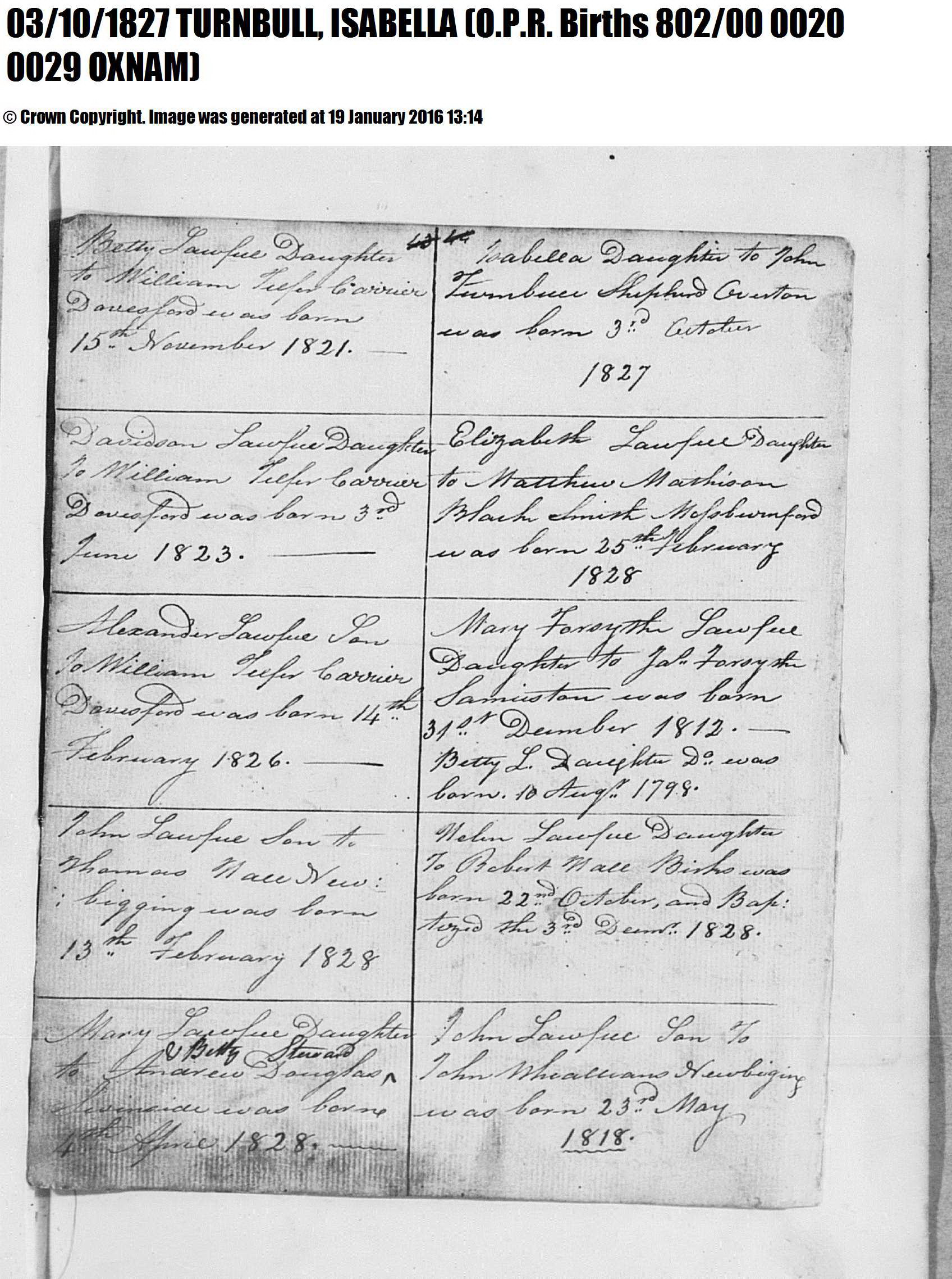 | Residence | Elizabeth Turnbull lived in Oxnam, Roxburgh, Scotland, in 1829.5,5 |