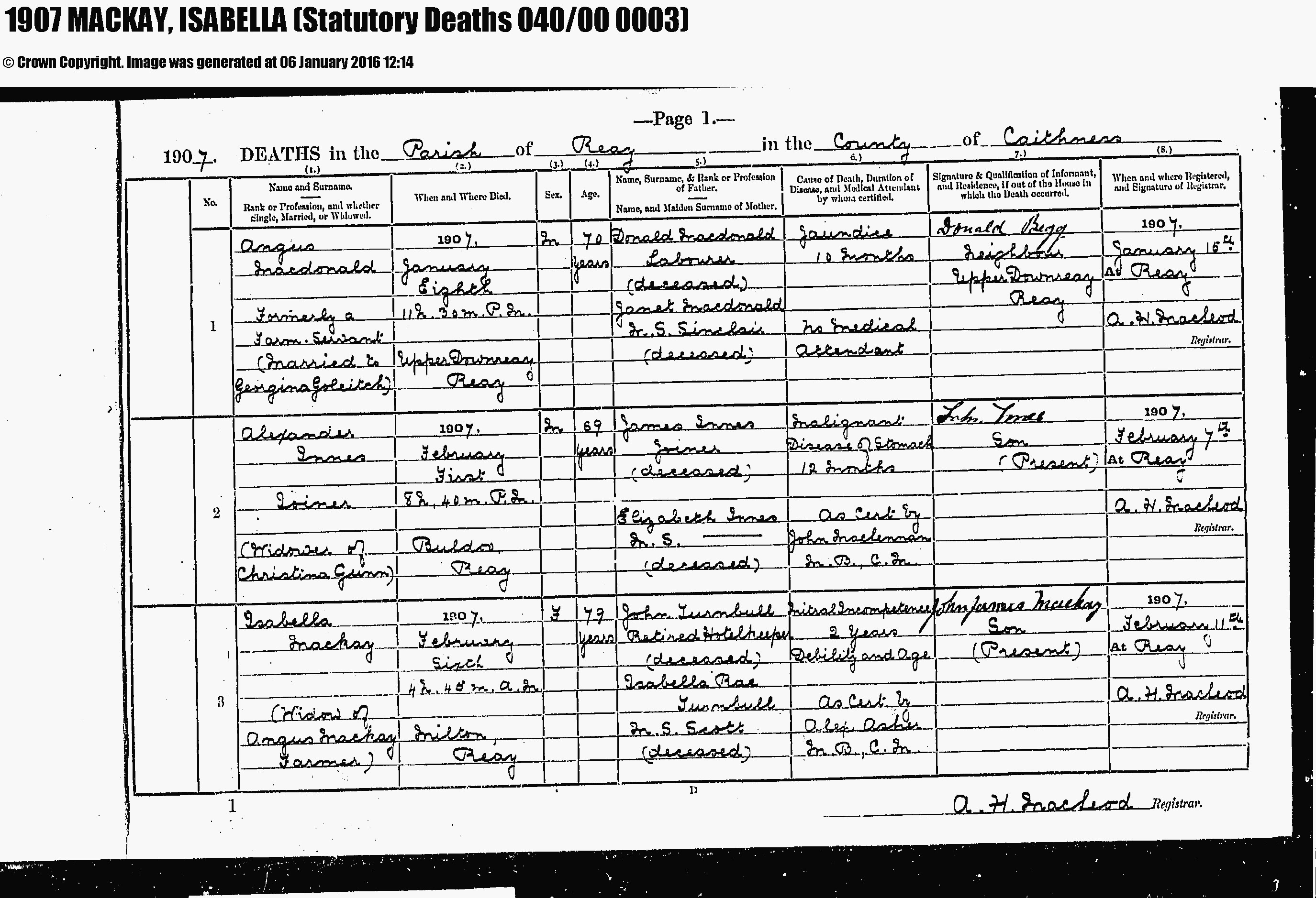 - [S3029] Ancestry.com, 1901 Scotland Census, Parish: Reay; ED: 1; Page: 14; Line: 9; Roll: CSSCT1901_10
