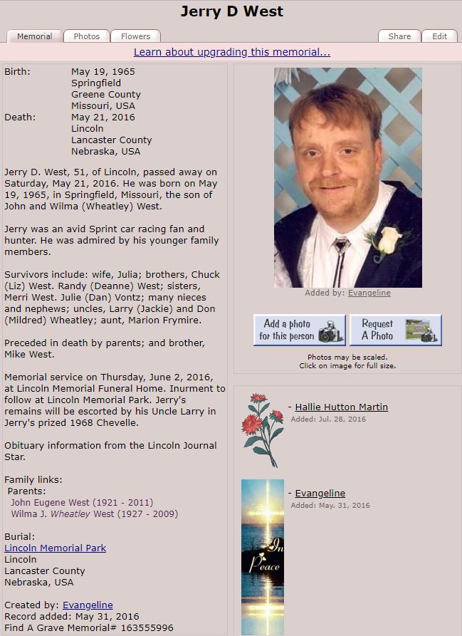 - [S3013] Ancestry.com, U.S., Obituary Collection, 1930-Current, Kearney Hub; Publication Place: Kearney, Nebraska, USA; URL: http://www.kearneyhub.com/obituaries/jerry-west/article_b2faf626-8af4-59bc-bcac-e10045fdf29f.html