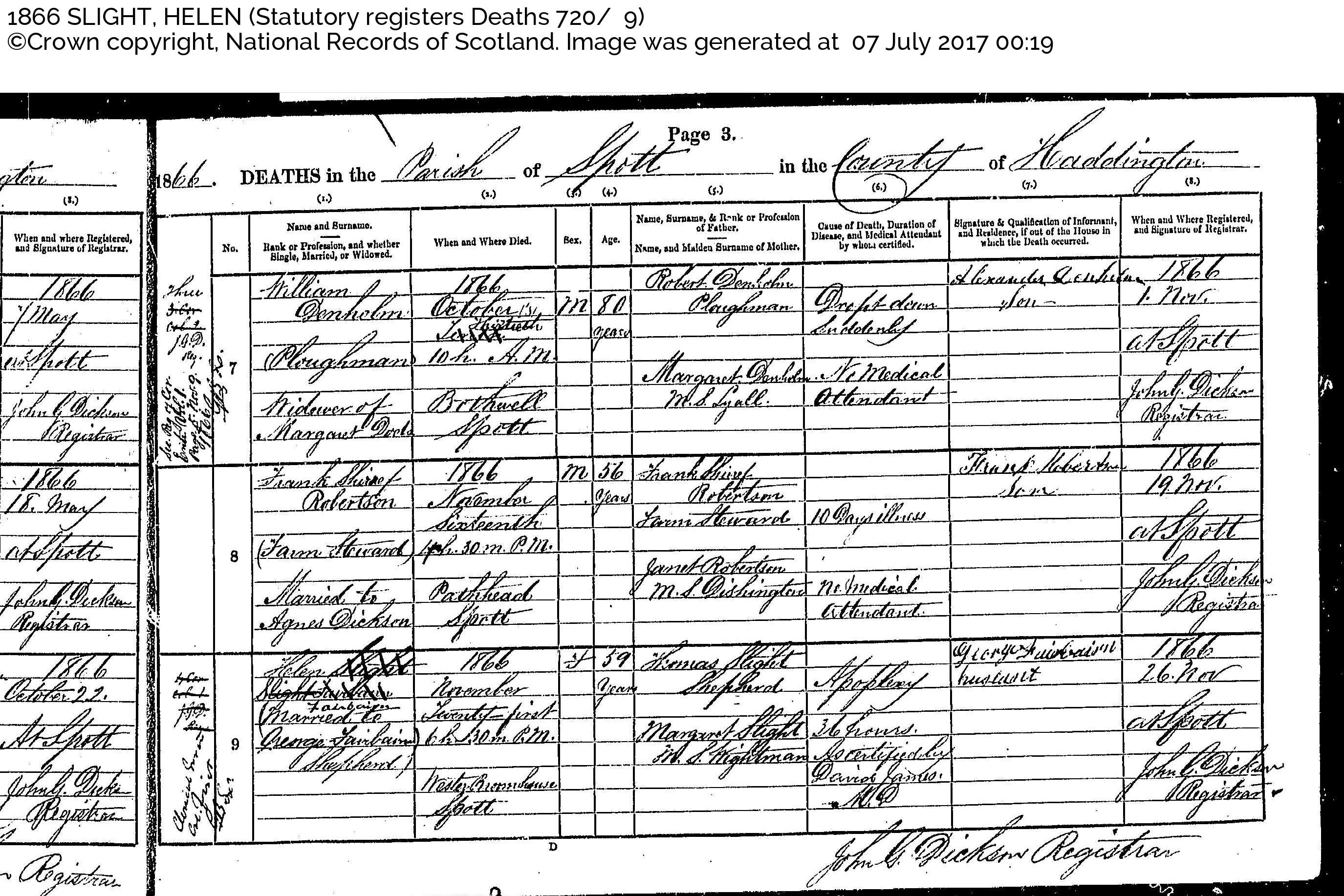 | Death | She died on 21 November 1866 at age ~57 in Spott, East Lothian, Scotland. |