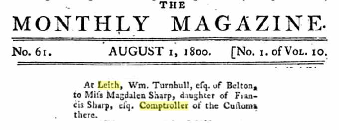 | Marriage | She married William Turnbull on 25 November 1810 in Spott, East Lothian, Scotland. Magdalene Sharp was, age 26, William Turnbull was, age 30. |
