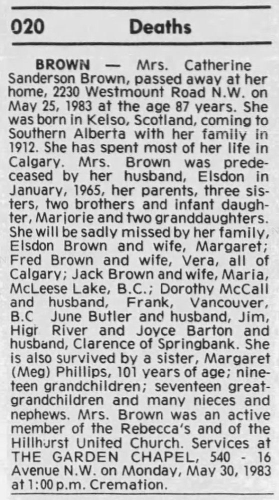 - [S2986] Ancestry.com, Canada, Newspapers.com™ Obituary Index, 1800s-current, Calgary Herald; Publication Date: 27 May 1983; Publication Place: Calgary, Alberta, Canada; URL: https://www.newspapers.com/image/483409726/?article=81c8232a-3806-4f73-83df-cfaed009ea70&focus=0.18453878,0.1423168,0.33659837,0.28059262&xid=3355