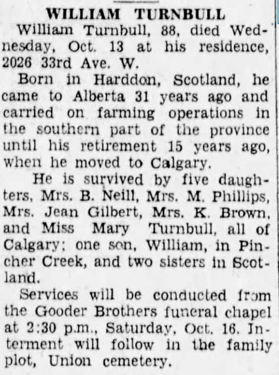- [S2986] Ancestry.com, Canada, Newspapers.com™ Obituary Index, 1800s-current, The Albertan; Publication Date: 14 Oct 1943; Publication Place: Calgary, Alberta, Canada; URL: https://www.newspapers.com/image/729073945/?article=35b81078-c1d9-4de5-b86a-063a7fd66f6d&focus=0.7321959,0.20399116,0.8520494,0.3103696&xid=3355